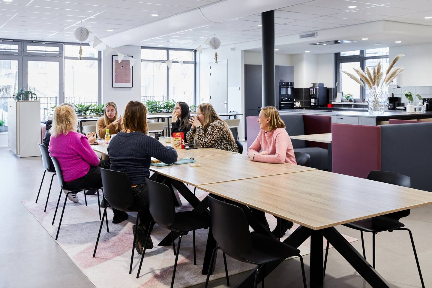There are plenty of opportunities to meet up, learn together in the Learn-Inn, work alone at one of the individual student desks or have a chat on the comfortable coach seats with playful artwork on them. These seats also give warmth and cosiness to the environment. The planters around the various seating areas add a finishing touch.