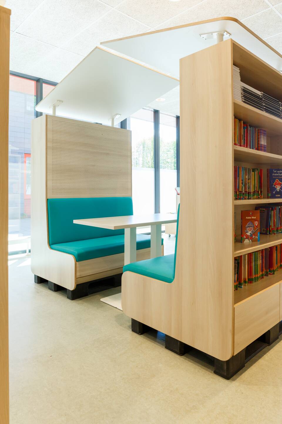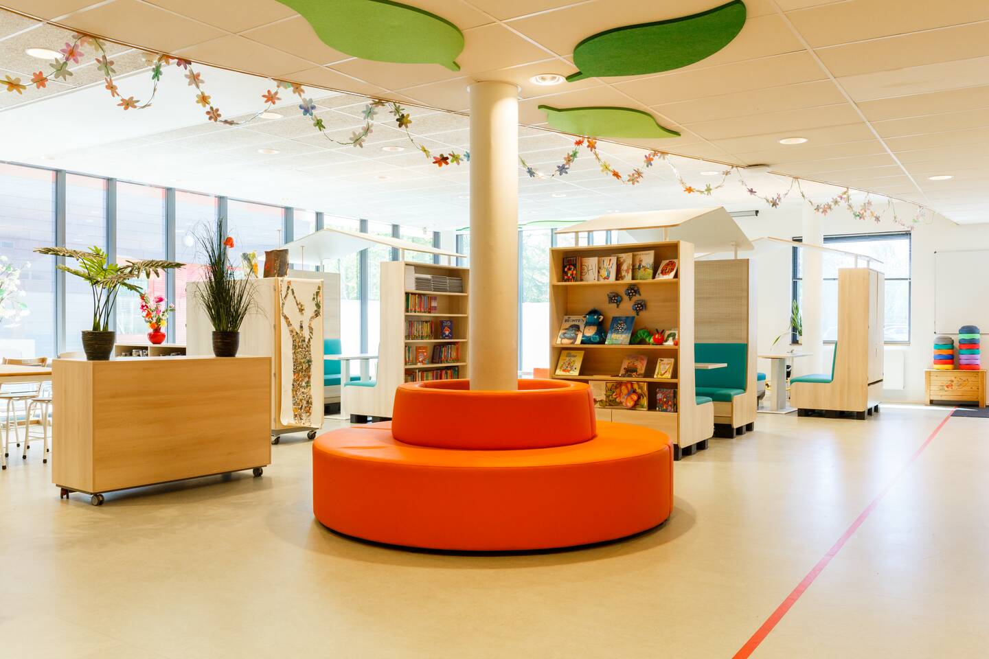 The interior of the auditorium supports the abovementioned vision; it provides space for children to come together and interact. The round sofa with a big tree in the middle (which continues into the ceiling with acoustic leaves) is definitely the eye-catcher and place to be at the auditorium. The group tables, surrounded by playful artwork and room dividers provide ample room for creativity.