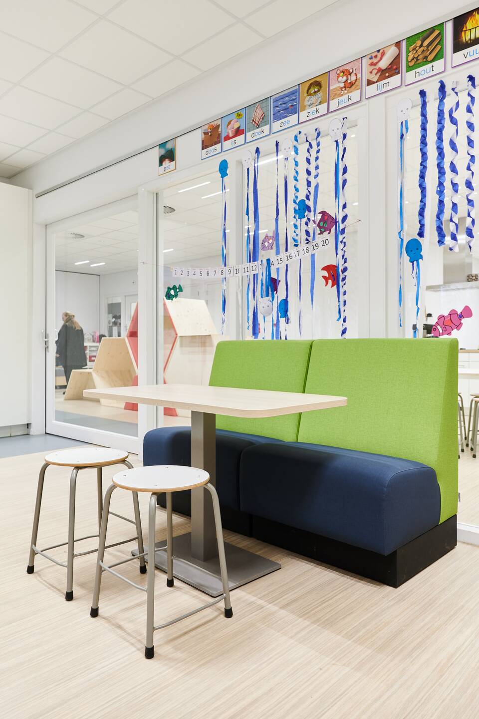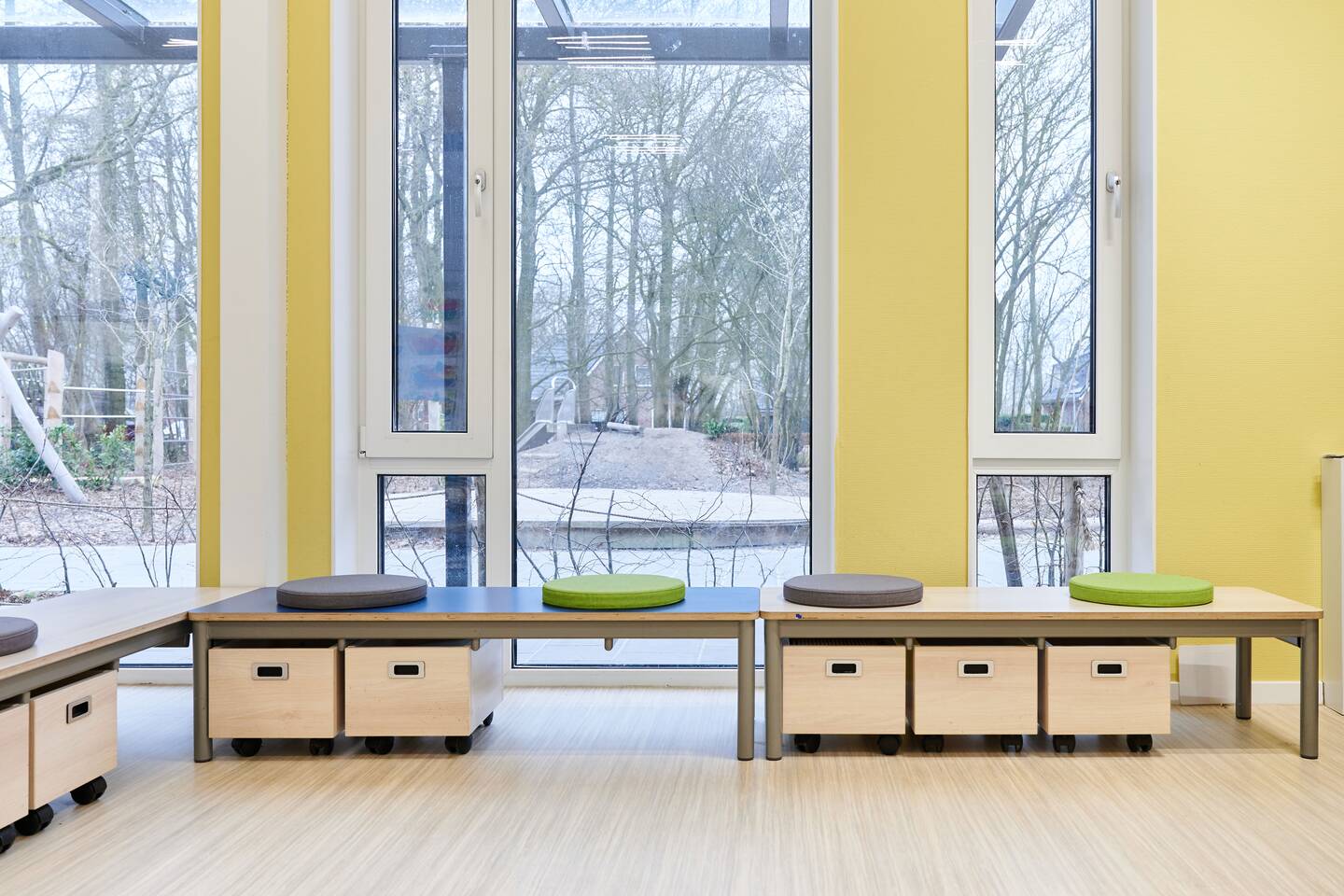 The classrooms have also been furnished with pleasant seating areas including benches for children to create their own spot and work on projects together, for example. The classroom of grades 1 and 2 features a combination of benches with roll-out trays and colourful round seat cushions, ideal for making a circle discussion even more familiar or for playing an educational game together within the circle with objects from the roll-out trays.