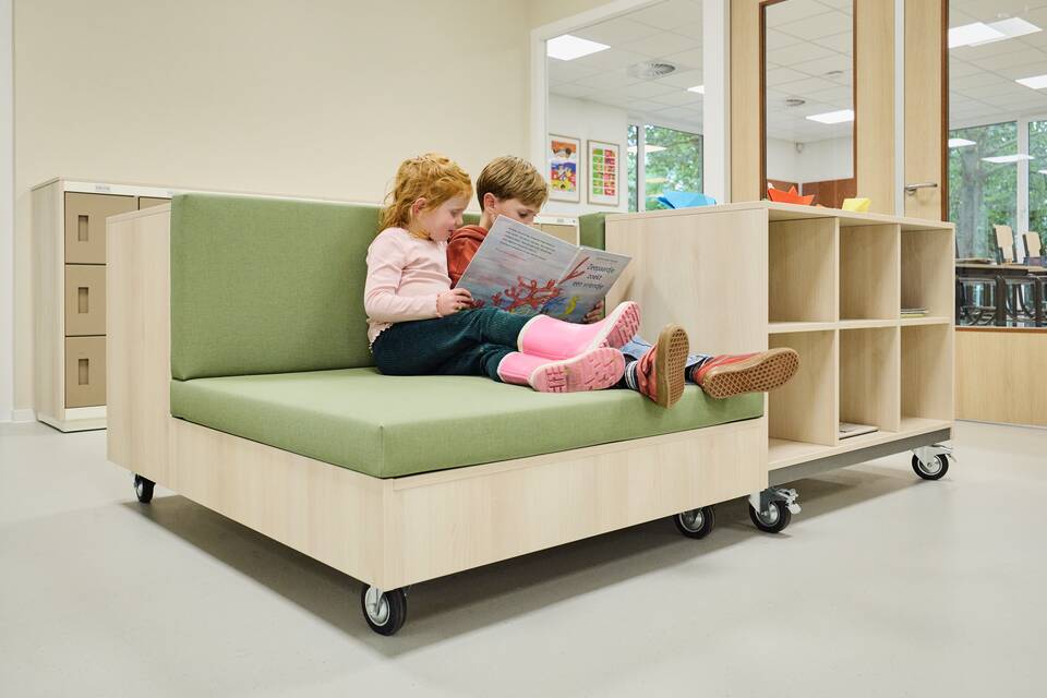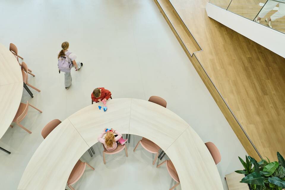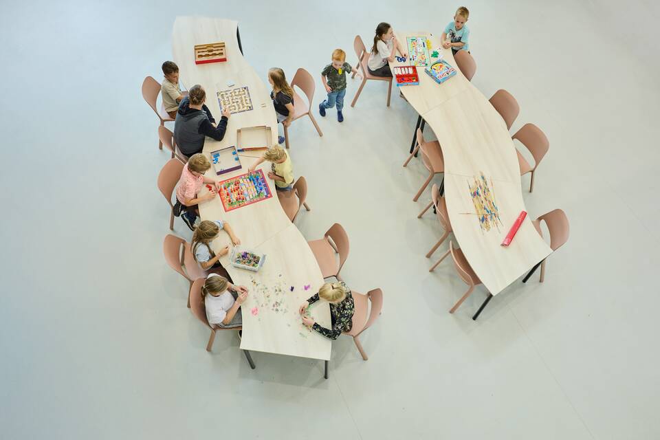 “We saw, for instance, student desks with rounded corners. Perfectly suited to the friendly, soft look we envisioned. That’s also where the idea arose for the long, wavy tables in the central hall. The after-school care groups sit together there beautifully. And when we sing with the entire school, the tables can be moved aside in no time.”