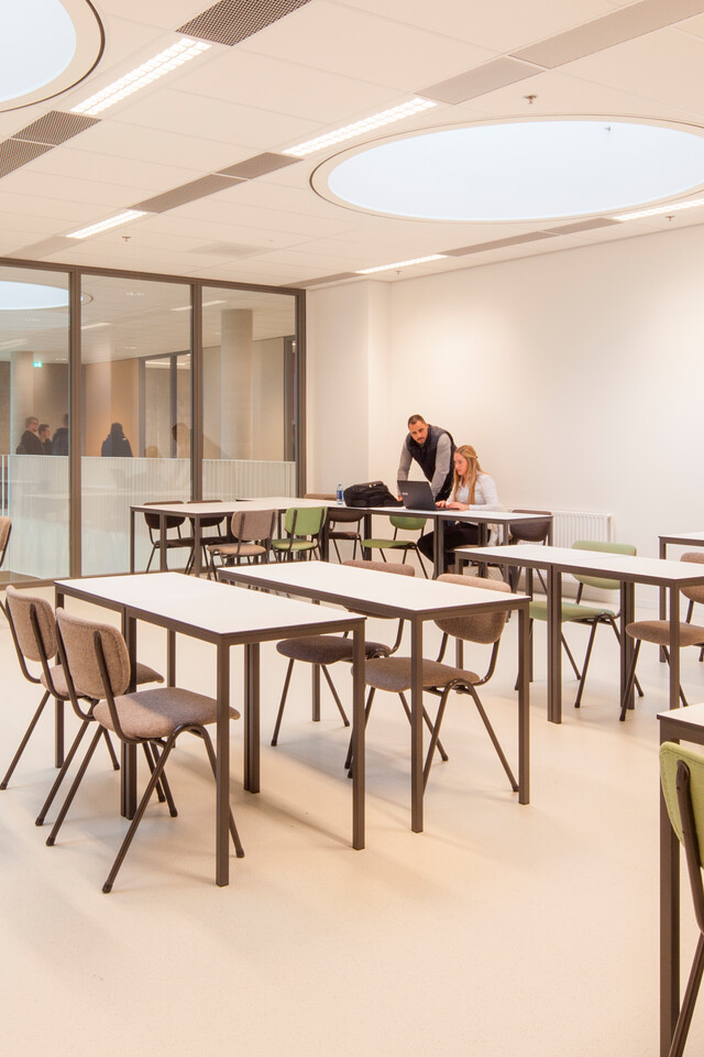 Gispen was asked to furnish the entire building. From the library to the classrooms and lecture hall, from consulting rooms and workstations to the juice bar and restaurant. This included both separate pieces of furniture and lighting, up to and including professional cable management. We went all the way in making sure that the interior matched the remarkable designs of the architect collective of deMunnik-deJong-Steinhauser. Designs that required both interior construction contractor Gielissen and Gispen to come up with many tailored solutions.