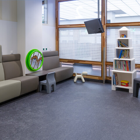Some highlights: the custom-made waiting benches in the lobby, with purpose-built children’s tables in between. The custom-made reading tables by Gispen. A magazine rack of the same material as the reading tables, which was incorporated into a coffee machine cabinet. Or the adhesive foil with a carpet-like print on it, which does a good job of creating an imaginary line between the waiting area and the rest of the zone. Hygiene is important; the foil complies with hygienic standards, while the print still provides that homely feeling.
