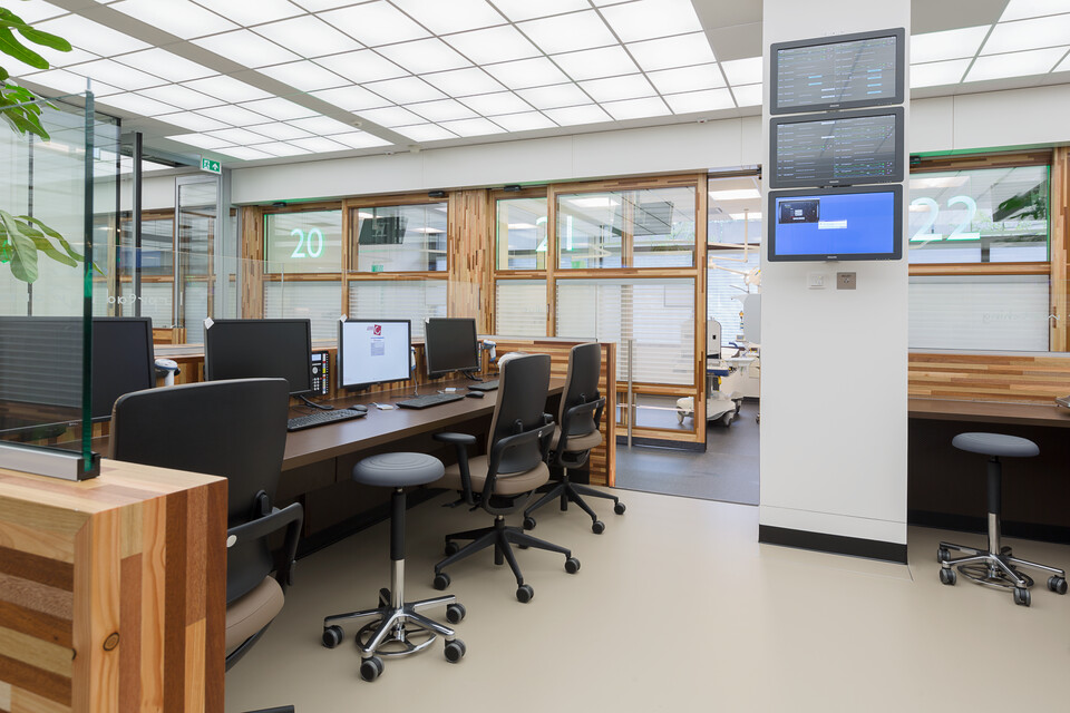 Gispen furnished a number of lobbies (waiting areas): the reception, the Emergency Room lobby and the lobby of the Walk-in Clinic. We also furnished two family rooms, which are multi-functional rooms where a private conversation can be held or where relatives of the deceased can be taken care of. We installed seating solutions at the various registration desks, created a coffee corner and supplied the office furniture. Our designs were based on patient logistics. How do they come in? Where do they need to register? What kind of experience do we want to give them while waiting? Some peace and quiet, real plants and distraction in the form of art and interactive TV are all included in the final result.