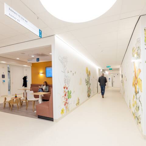 The hallways are highlighted by large graphics on the walls of nature, plants, flowers and animals. Nelleke: “This clearly makes it a children's department, but the graphics are not too childish as they should also appeal to 18-year-olds.” The outpatient clinics are home to the friendly-looking, organic Gispen TM Doc consultation table. The medical practitioners use Gispen ZINN artificial leather office chairs – befitting the strict hygiene requirements, as artificial leather is easy to clean within Radbouducm's cleaning regimen. The waiting areas have special tables and chairs for children as well as coach seats. The coat racks are at children's height. Cheerful wall elements and peepholes finish it off. Iris: “We also involved the Children's Advisory Council in the decision making process, especially for the furniture in the square.”