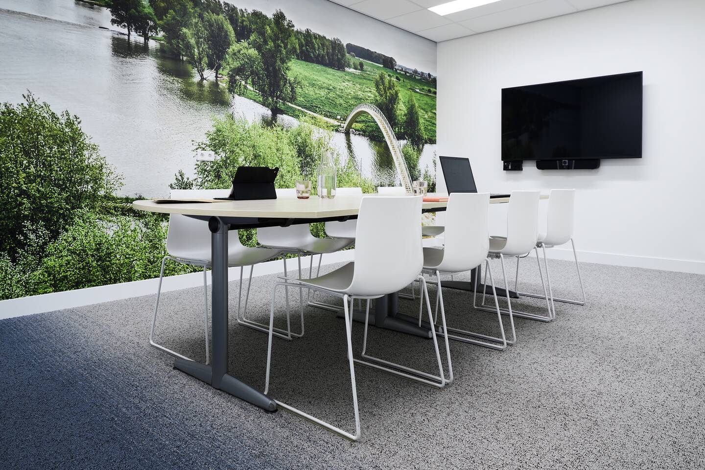 'We kept the theme close to the Nijmegen area: groynes along the Maas and Waal rivers. The interior design was to reflect a kind of river landscape,' Iris explains. 'Each office is basically a groyne along the river shore, with furniture to match. The corridors represent the rivers, and the carpet tiles slowly fade from blue into green. We photographed all kinds of bridges in the Nijmegen area and put up a picture of a different bridge in each office. It was important to us that the building forms a single entity.'