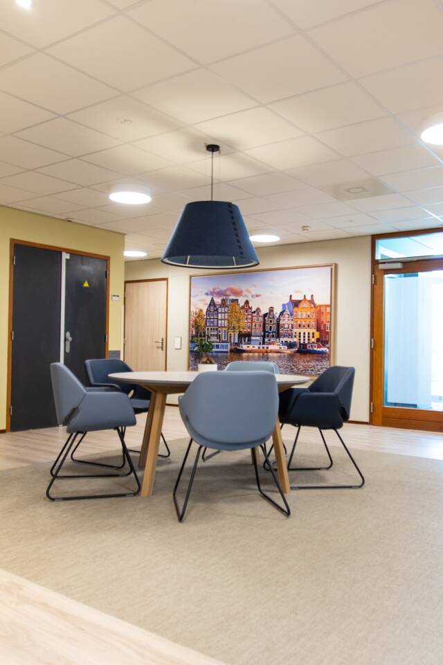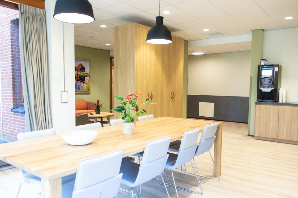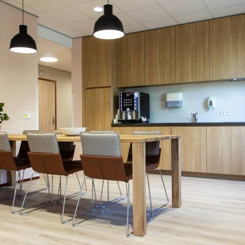 Creafort round tables with white tops and wooden legs have been installed throughout the new department. These are accompanied by somewhat heavier Artifort Gap chairs, upholstered in Silverguard; a soft and supple artificial leather which has the look and feel of fabric. This adds to the warm ambience of the room and is also hygienic. The Gap chairs come in various colours. Moreover, Gispen Triennial Project chairs with cantilever frames are combined with Exsta solid oak dining room tables. These are well suited for intensive use and their backrests have also been upholstered with Sylverguard synthetic leather. Those who want to relax in one of the living rooms can do so on sofas by Exsta. In addition to tables, chairs and benches, Gispen also supplied the lighting.