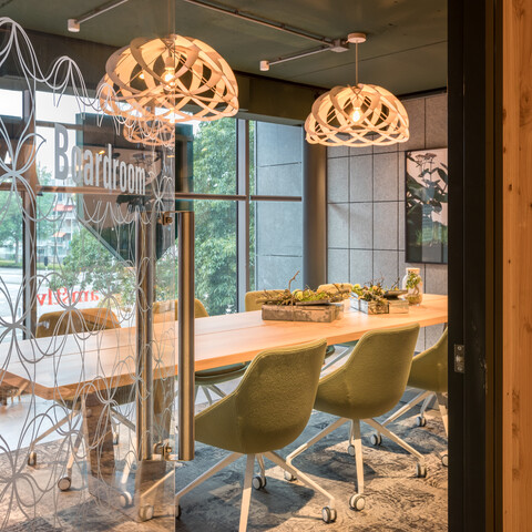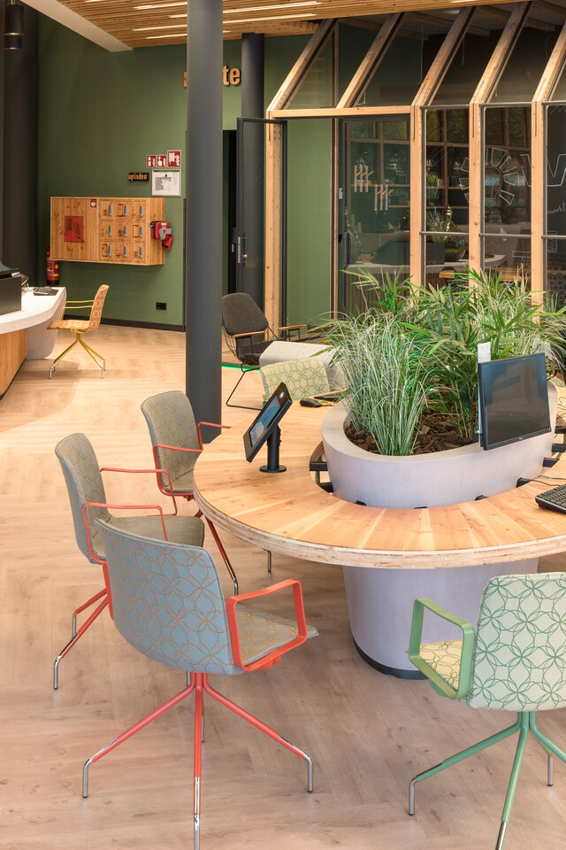Zwartwoud both designed and manufactured the custom furniture pieces, including conference tables, bistro tables and agile workstations. Eric: ‘We searched for the most responsible production methods for all the new furniture. All the custom work has been constructed in such a way that components can be replaced or reused separately. We made tabletops out of old window frames and doors. We made lamps out of sheet material from collected coffee cups. And old ABN AMRO corporate clothing has been reused for the acoustic panels in between desks’. Claartje: ‘We also searched through the Gispen collection and made a selection of only the most sustainable products. Such as Nomi, the modular chair with interchangeable covers, the Gispen circular and modular desk programme, and the Sett CE sofa, which is made out of 95% recycled materials. We reupholstered chairs with eco-label fabrics. And supplied handmade wooden tables, which were sourced from the same region our partner Arco operates from, as well as armchairs and stools made of recycled PET material from De Vorm. The colour schemes are very organic; we deliberately opted for solid autumn-themed colours, with many shades of brown and green.”