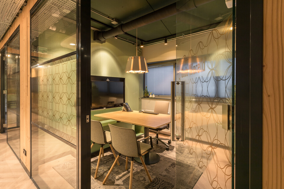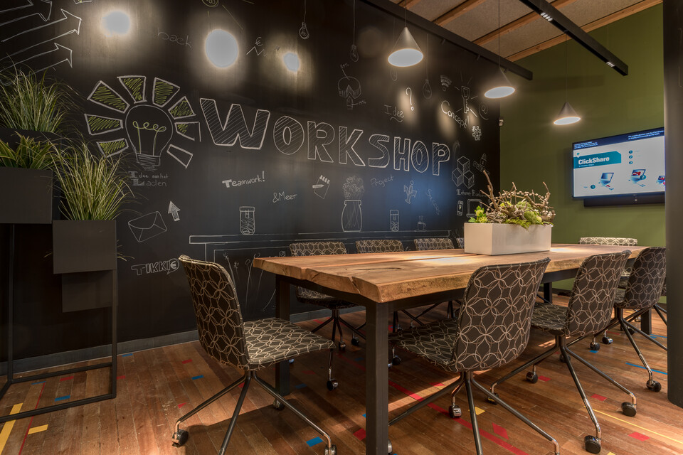 On the ground floor, customers check in with the Host. They can take a seat in the waiting area, pull up a chair to the reading table or keep their kids busy in the children's corner. Complete families can be accommodated here in a welcoming manner. In addition, there are three moderately-sized consulting rooms and a large seminar room. On the first floor, one can find the consulting and conference rooms, as well as a number of workstations. Claartje: ‘We have deliberately created a variety of consultation areas for the different types of clients who come in for financial advice. Elderly people, for example, might prefer to sit down at a conference table, where younger people would rather receive advice at a standing table or in a sitting area.’ Each consultation area has its own design. There is an Ajax room (many of our customers are supporters) and a Nature Room, which includes a table made of grass and walls that have been lined with recycled wood.