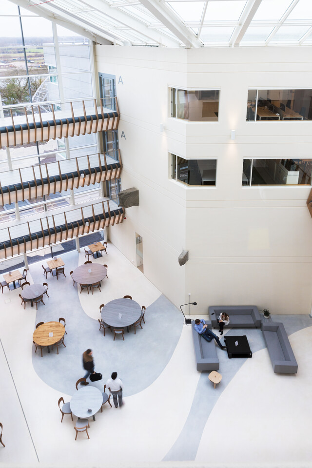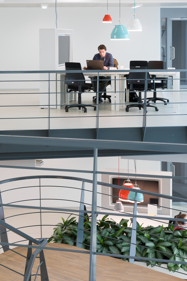 The concept of COARE Architectuur forms the base of the new building. In the words of Jan Willem Leverstein, partner at COARE, ‘A design that belongs to us all. The input of the client and its employees was crucial to the realisation of the final design. In about four weeks’ time we spoke to 150 people, in groups of 10 to 15. We discussed both their personal ambitions and the ambitions they have as an organisation. We then took these ambitions and translated them into form.’ Important requirements: transforming the introverted building into a more extraverted one and connecting the inside with the outside. The result is a high level of transparency; you can now look through the building from one side to the other. There was also a need for a closer connection between the different areas of the office – which has been accomplished via the many stairs and voids there. The new building had to become the home base for all Alliander employees, with ample room for meetings and interaction.