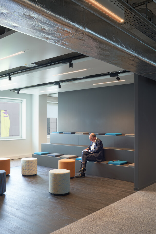The colour scheme created by the interior architect is reflected in the furniture. The workstations are fairly neutral essentially; the colourful accents are found in the upholstery of sofas and footstools, for example. Eric Wezenberg of ZENBER: ‘Various shades of blue can be found in the interior. The aqua-blue Asido footstools for example, which are scattered in all corners of the departments, some of which in contrasting colours such as cognac.’
