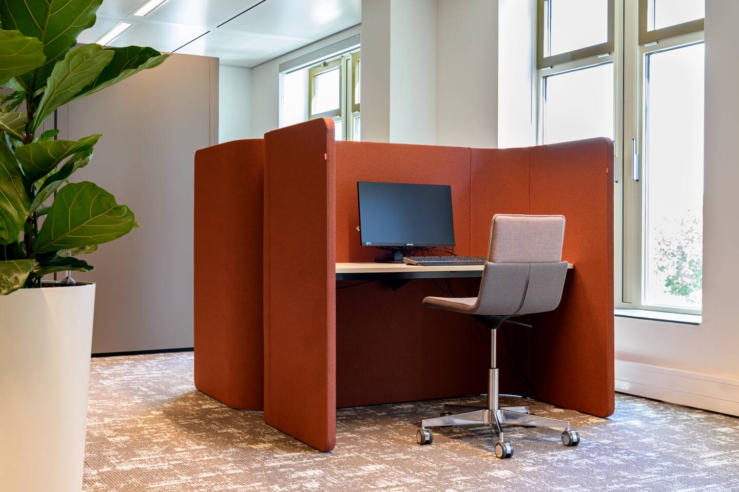 We created a workplace where the team members can easily switch from desk work to holding a meeting using the Gispen MOXX booths and Qabins. Christa Paauwe, senior account manager at Gispen: ‘The single booths are used by employees to work in silence or have an online meeting. There are also several booths that can accommodate multiple people; for pairs or even the entire team. An added benefit is that they can be completely dismantled. Meaning that you can easily take them with you when moving to another building. Floor Keijzer: ‘The MOXX booths are a wonderful solution. You have a certain picture in mind of what it should look like, but you can't be sure how it'll turn out. The Gispen interior architects were very helpful and the result is exactly what we hoped it would be. All the booths are being put to good use and - combined with the lockers, cupboards and plants - it makes for a comfortable workplace and spacious interior.'