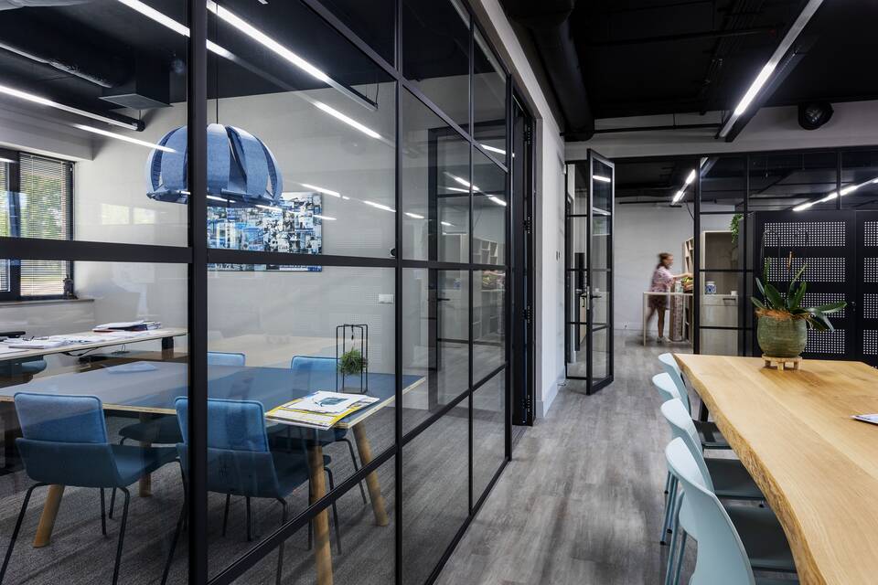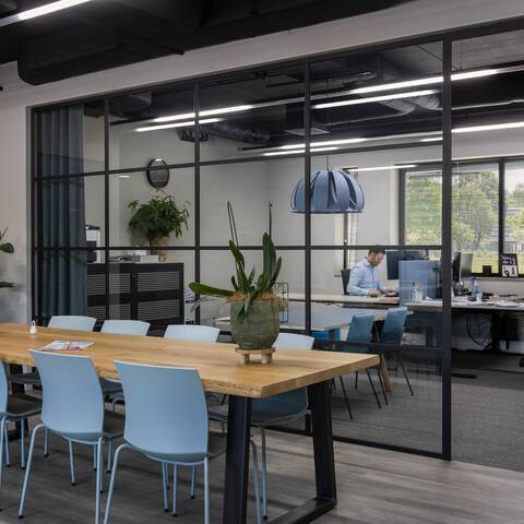 Danon van der Hoeven was involved in the interior design of NAS Geffen's new premises as the appointed Gispen account manager. "We opted for a warmer variant of the corporate blue for the furniture and walls. This shade of blue also serves as an accent colour in the flooring. The addition of a thread in a warm colour creates a homely atmosphere. The many plants, wooden accents and natural tree trunk tables also contribute to making the office feel familiar. Moreover, the heavy use of glass has resulted in colleagues having more contact with one another."