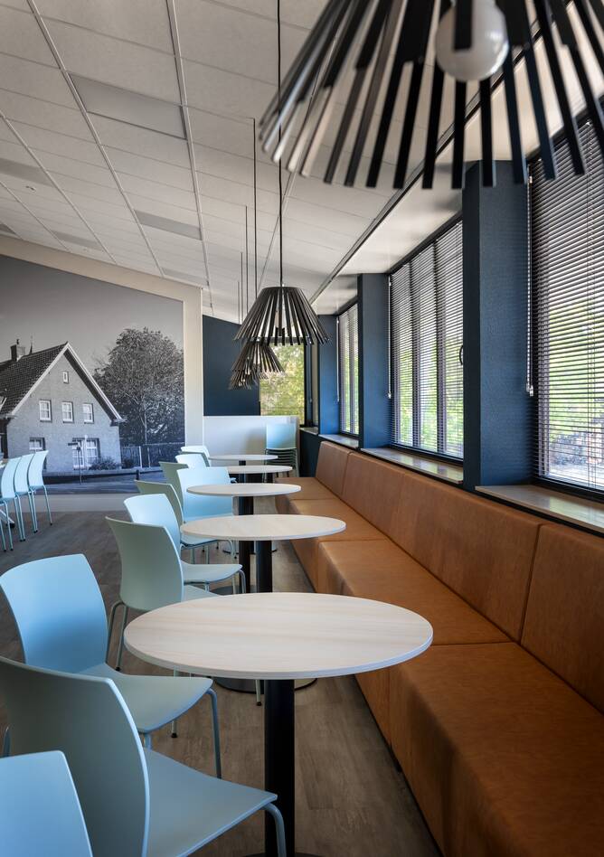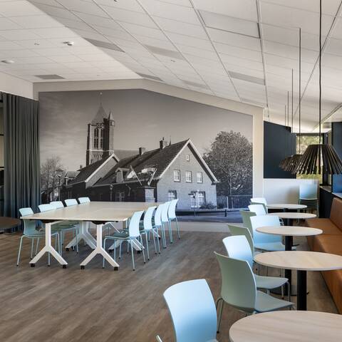The multifunctional area on the first floor is used for training courses, but also for anniversary parties and Saint Nicholas celebrations, for example. The room exudes the cosiness that Brabant is known for. Dirty work clothes or spilt fried snacks are no problem for the artificial leather sofa and plastic chairs with recycled shells. Danon van der Hoeven: "We opted for Gispen TEAM tables in different configurations here: high models with stools and low round tables. This adds to the informal and pleasant atmosphere. The Forbo top layer is a natural material that feels warm to the touch. These tables are light, due to their poplar plywood construction, and are therefore more sustainable when transported. NAS Geffen was very enthusiastic about the sustainable design and high quality of the Gispen furniture, which allowed us to incorporate a wonderful range of products."
