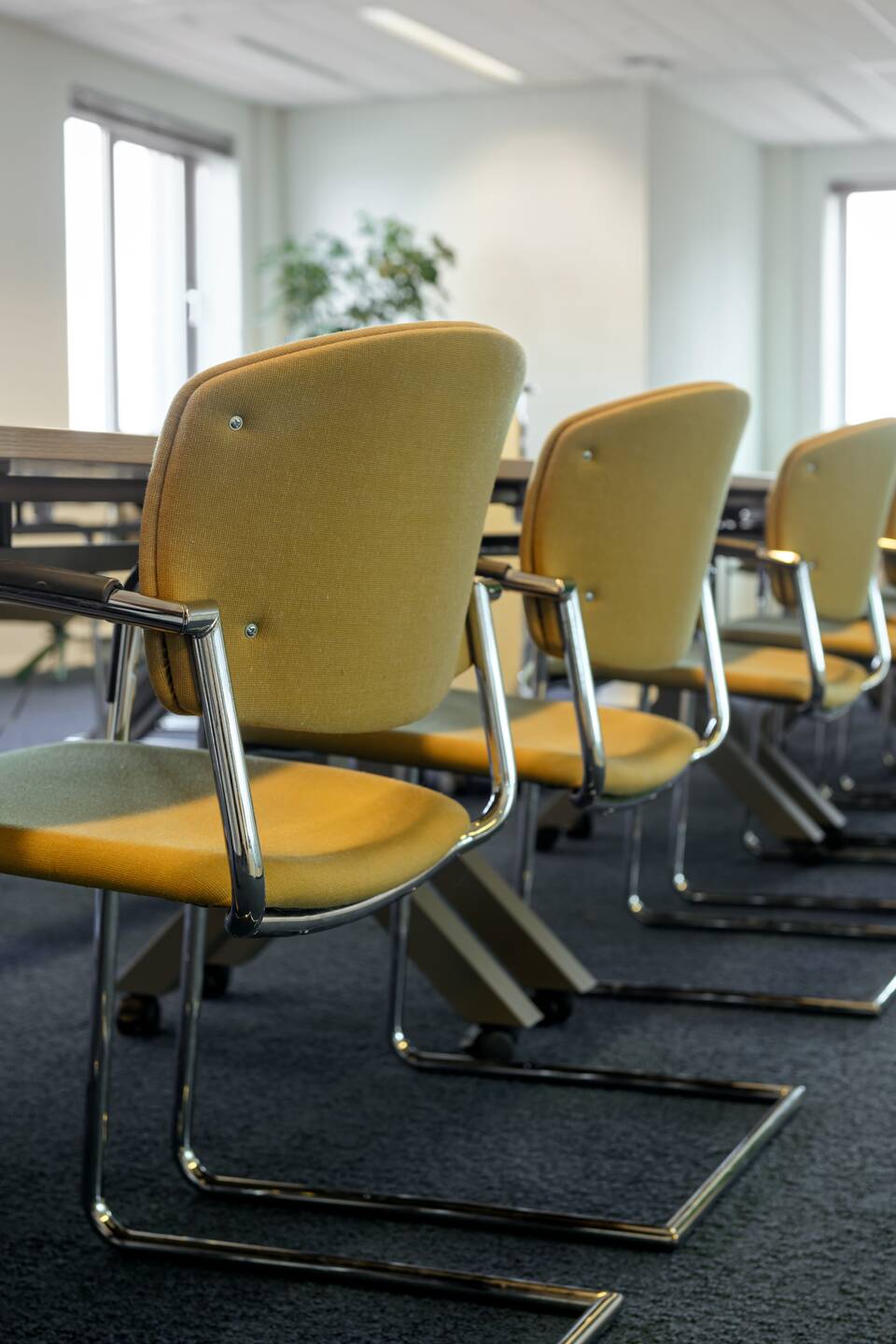 We did not leave it at reusing existing structures; the furniture was also selected from a starting point of reuse. Rob: 'We got together with Facilitair Bedrijf DJI to make an inventory of the furniture in storage and determined which products were eligible for reuse – after refurbishment, if necessary. There were quite a number of them!' Some of the furniture needed no attention at all, while other pieces were refurbished by Gispen. From cleaning and reupholstering conference chairs to repainting coat racks. The (wooden) dining chairs were turned into more luxurious conference chairs by reupholstering and upgrading them. Marijke: 'We left one of the chairs in its original state to show the upgrade.' Rob: 'A total of 177 pieces of furniture have been given a new purpose at the hub. Only then did we assess where new, circular furniture was needed.' Examples include sustainable Gispen NOMI chairs and Gispen sit-stand conference tables. Marijke: 'We also wanted to give the interior a nod of recognition to DJI. This shows in the footstools that were made from old uniforms, lamps and helmets by prison inmates.'