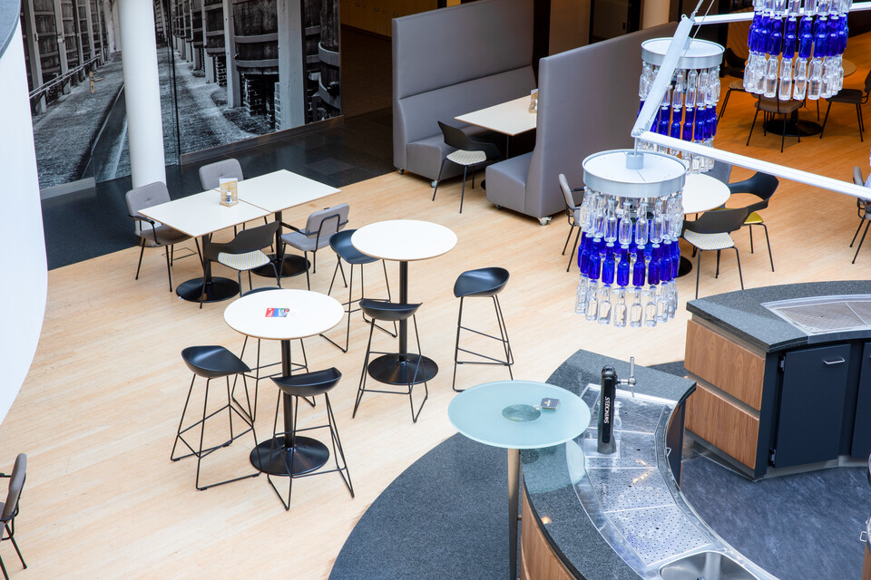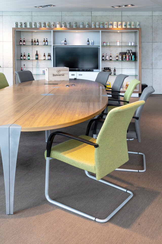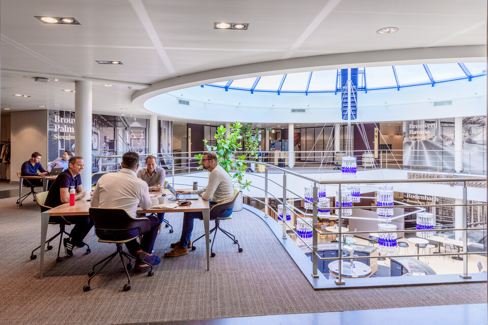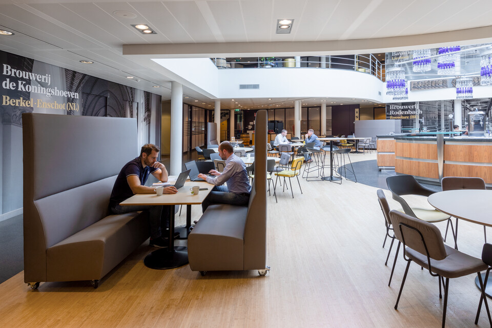 The head office of Swinkels Family Brewers is located in Lieshout. A footbridge connects the building with the breweries and malting plants on the company grounds. HR, Finance, IT, Procurement, Sales, Communication, Innovation and the Facilities & Construction office; they are all accommodated in the head office. Fabiènne van Thiel-Swinkels, Head of Facilities & Construction: “Approximately 250 employees work here in total, occupying both personal and agile workstations. In addition, colleagues regularly fly in from our other branches in Belgium, Ethiopia and France.” The original design of the building has already made it a natural meeting place for people; meeting up at the bar in the central, open atrium for example. However, the colour schemes no longer matched with the company's new corporate identity. Fabiènne: “The most dominant colour was blue previously – ‘Bavaria blue’ – but in recent years we have added many brands to our beer portfolio. In addition, the building was once designed for 180 employees; today we have to accommodate 250 to 260 people. It was getting crowded – which affects the atmosphere and work experience.”
