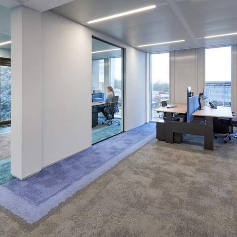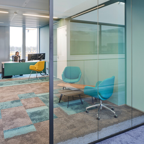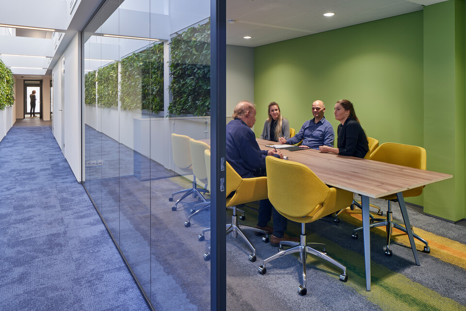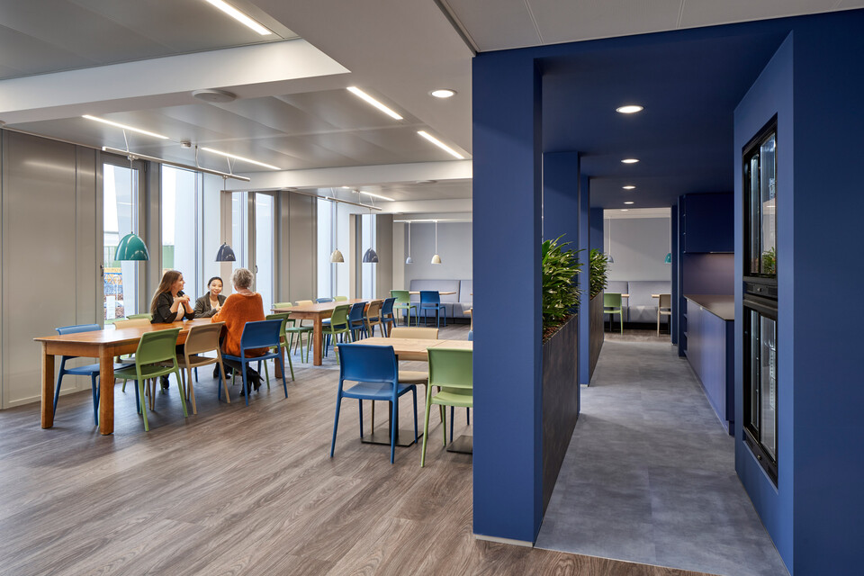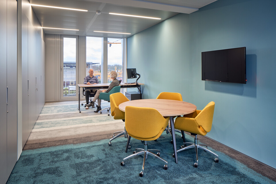 Van der Spek is your partner in equipment: from excavators to tower cranes. Its head office in Vianen was built in 1972. Jaco van der Spek, client / project supervisor: “The building and its interior hadn’t been touched for years and were in serious need of a renovation. We had to choose between redoing everything and reusing things wherever possible. We deliberately chose the latter option.” SchilderScholte Architecture came up with a design for a complete renovation. Gispen – a company in our area, which we liked – fully furnished the renovated office. Interior architect Hill Scholte: “The steel load-bearing structure of the building, the roof and the mezzanine floors have all been reused. All the ceilings, walls and facades have been replaced. The new facade with its vertical lines catches your attention right away. The users, i.e. the staff of the head office, were extensively consulted about the interior design. We arranged a workshop during which we went through the entire building together: what do you like, what would you like to change? The users’ wishes were clear: lots of space, lots of light, more interaction and communication.” Jaco: “As well as a future-proof interior, with agile workspaces for our field workers and sit-stand workstations for everyone.”