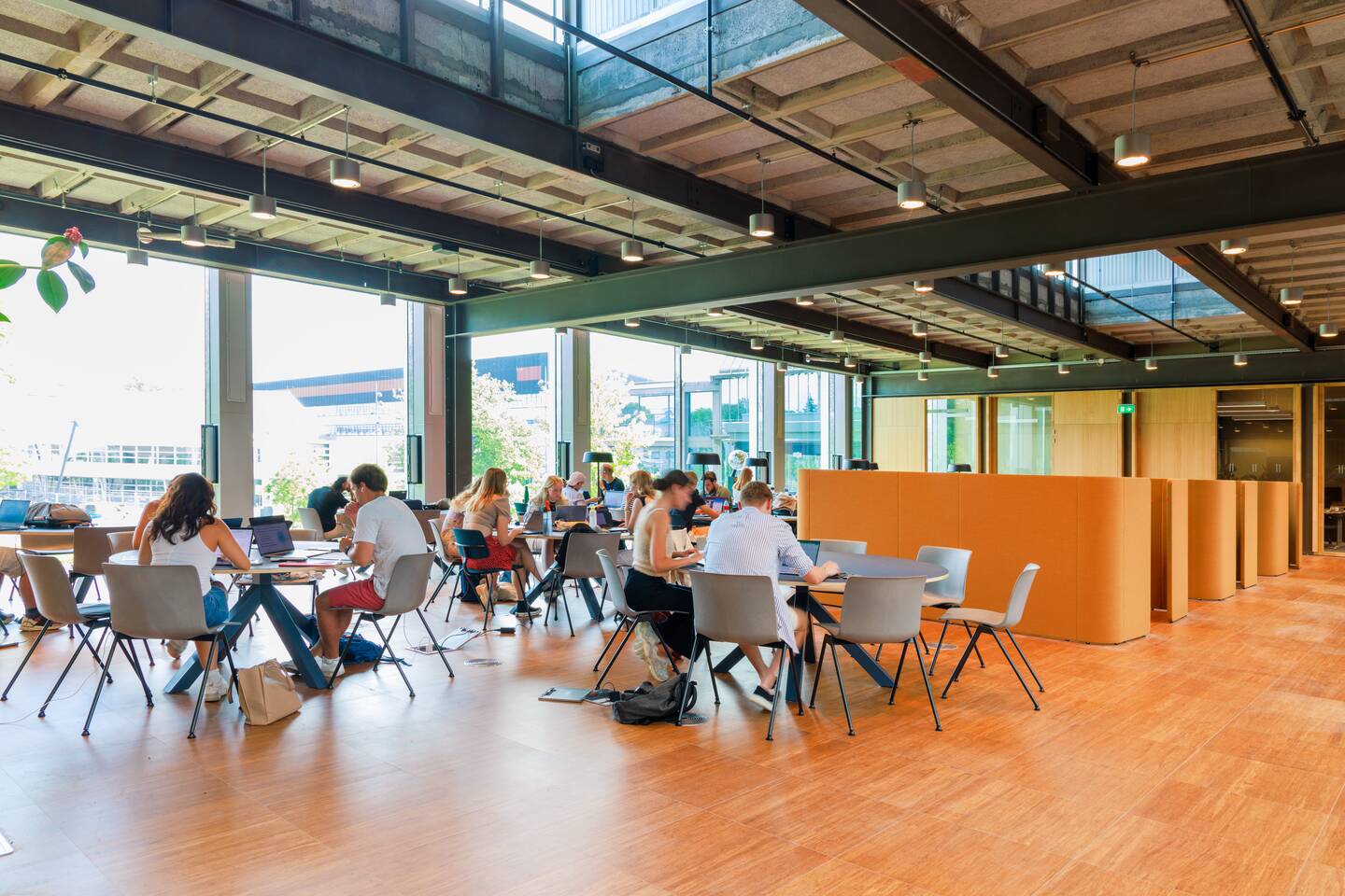 Bas de Jong, accountmanager bij Gispen: ‘Samen met de faculteit ITC en de architect hebben we een intensief traject doorlopen. Met Groen + Schild Architecten hadden we sessies over kleurstellingen en materialisatie. Het ontwerp ging oorspronkelijk vooral uit van nieuw circulair meubilair. Wij hebben onszelf continu de vraag gesteld: wat kunnen we nog met het bestaande meubilair van de faculteit en retourgenomen producten van andere klanten in onze Circulaire Hub?’ Een scan van het bestaande meubilair wees uit dat veel hiervan niet hergebruikt kon worden omdat het niet meer aan de moderne Arbo-eisen voldeed. Wel zijn 120 bestaande lesstoelen schoongemaakt en opnieuw gestoffeerd – zij komen nu mooi tot hun recht in het restaurant en in de studielandschappen. Het overige bestaande meubilair heeft Gispen duurzaam afgevoerd. Jeroen: ‘Ik vind het een mooi idee dat dit nu door Gispen gebruikt wordt voor andere doeleinden.’