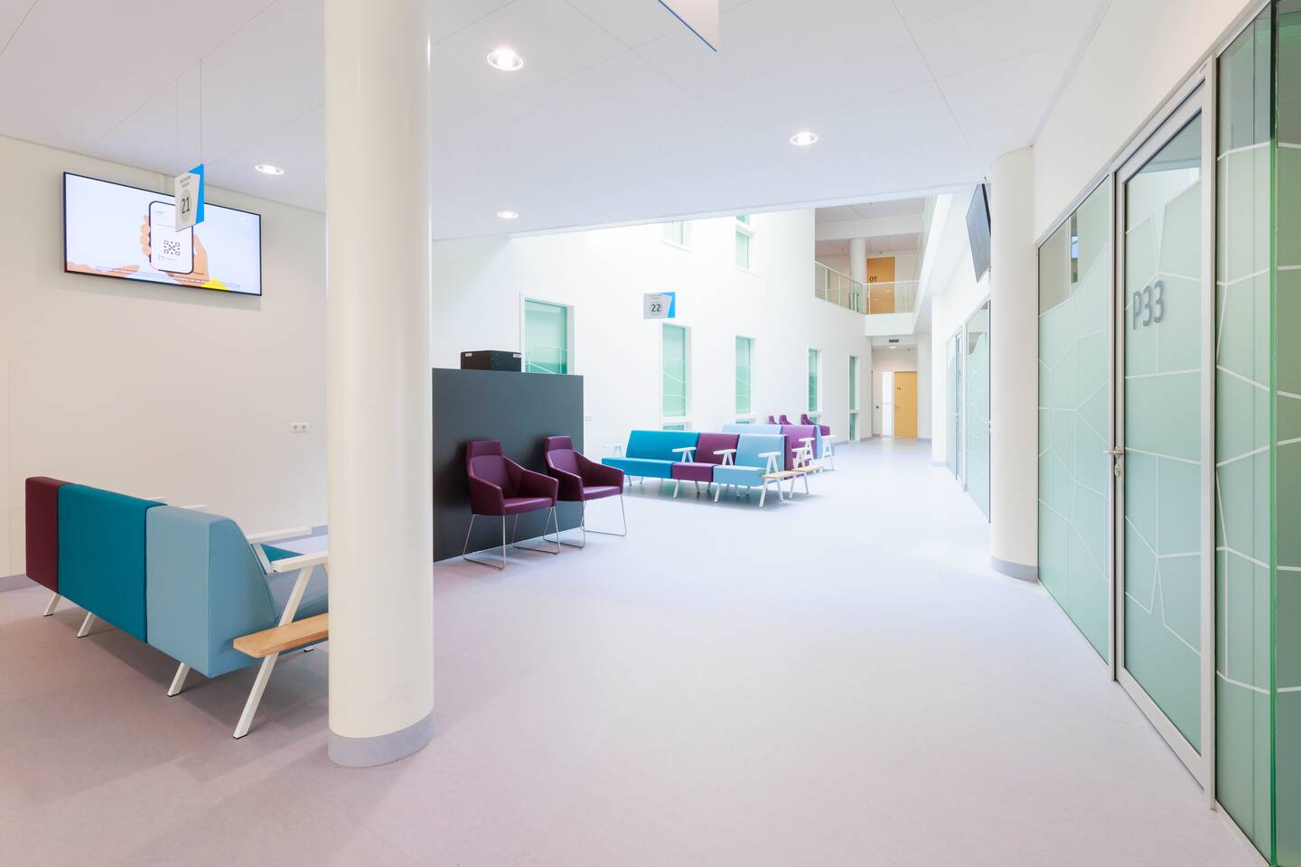 Sabine Gorter, accountmanager bij Gispen: ‘Patiëntcomfort en huiselijkheid waren belangrijke uitgangspunten voor dit gebied. We hebben dan ook bewust gekozen voor soft seating wachtmeubilair: we leverden een nieuw concept wachtbank van Havee Meubelen. Een modulaire bank die in verschillende opstellingen te plaatsen is met kleine tafeltjes als koppelelement. De verwisselbare kunstlederen bekleding, het duurzame PU Stamskin Purfect, is ter plekke op locatie te vervangen mocht dat in de toekomst nodig zijn. Rijnstate heeft deze kunstleder, samen met andere materialen, uitgebreid getest vanuit het oogpunt van hygiëne en infectiepreventie.’ Veel planten en de afwisselend blauwe en aubergine kleurstellingen van de wachtbanken geven het atrium de gewenste huiselijke touch. Voor patiënten die toch liever aan een tafel zitten, staan er op de begane grond diverse Gispen TEAM tafels met Casala Lynx III stoelen.