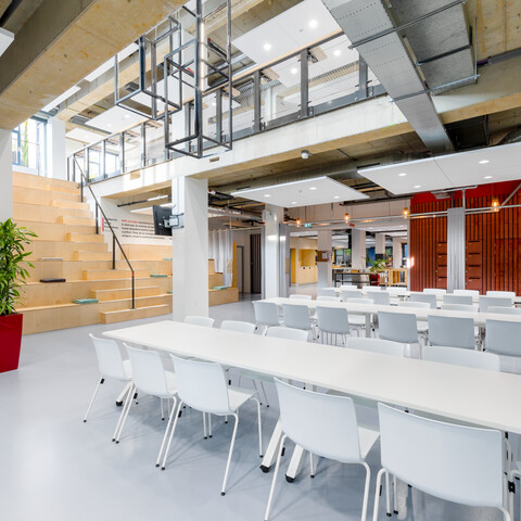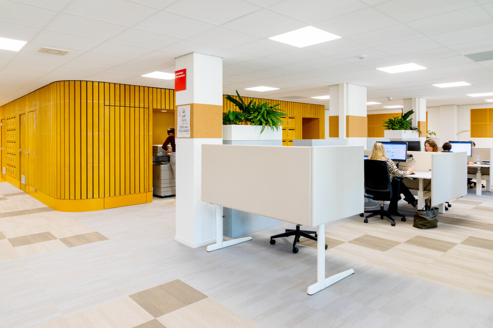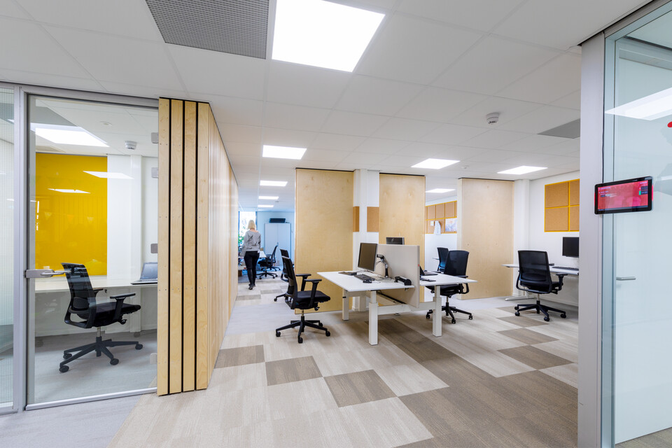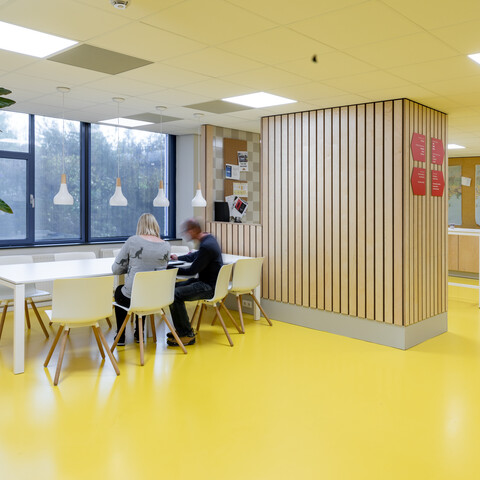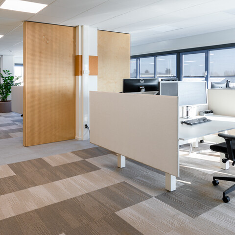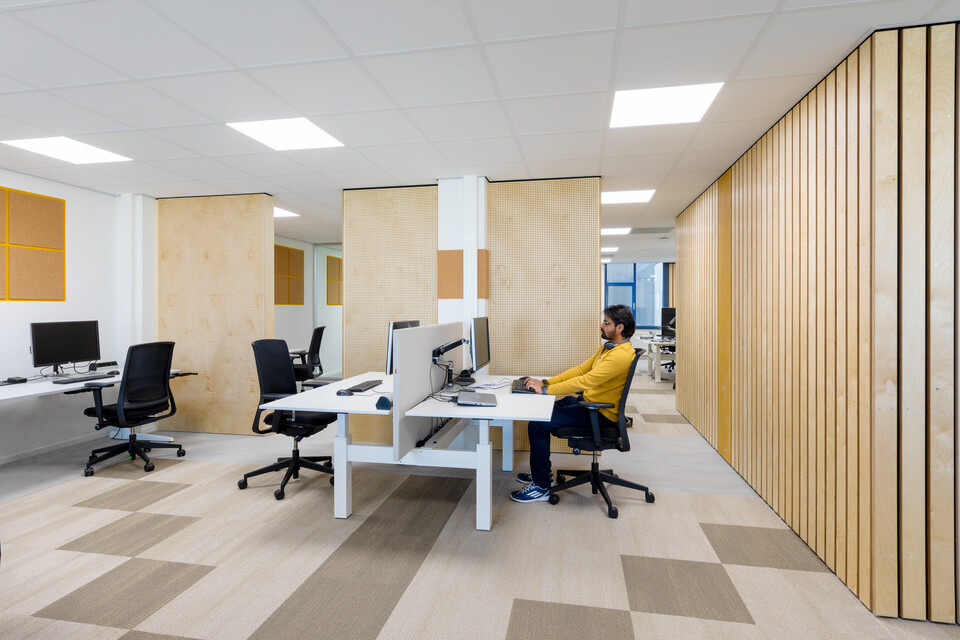‘In totaal zijn bijna vierhonderd medewerkers aan ons kantoor verbonden; gemiddeld werken er elke dag zo’n 230 mensen op kantoor. Sommigen moeten wennen aan de meer open structuur. Met name het flexibel werken, geen eigen bureau meer hebben en dus proactief bedenken wat je gaat doen en waar je dan gaat zitten, is nieuw. Ook merken we dat we toch wel heel graag met elkaar babbelen, maar gelukkig zijn er door het hele pand akoestische oplossingen. En we hebben natuurlijk de nieuwe ruimte in de kelder. Kortom: wij zijn blij.’
