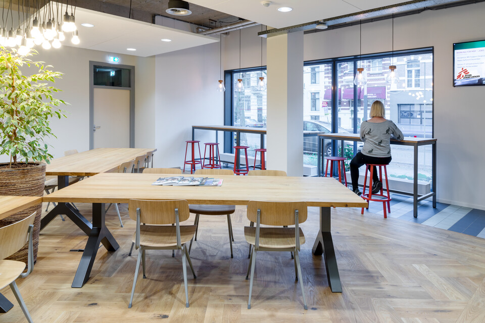 AzG Nederland vroeg Studio Valkenier als gebouw- en interieurarchitect: een lokale studio die op verschillende plekken in Amsterdam al een mooie stempel heeft achtergelaten als het gaat om slim hergebruik. Oprichter Wouter Valkenier: ‘We kijken telkens weer hoe we met heel eenvoudig materiaalgebruik zo effectief mogelijk kunnen omgaan. Waar kunnen we upcyclen, dus van restproducten nog iets moois maken? Hoe kunnen we bouwmaterialen slim recyclen?’ De aftrap waren sounding boards (klankbordsessies) op alle afdelingen onder leiding van Studio Valkenier. Tijdens deze workshops konden medewerkers hun input geven over de gewenste indeling en inrichting van het pand. WorkWire was verantwoordelijk voor het nieuwe werkplekconcept. Voor het meubilair liet de noodhulporganisatie drie partijen proefopstellingen verzorgen, uitgebreid te testen door alle medewerkers. Monique: ‘Gispen kwam als winnaar uit de bus.’