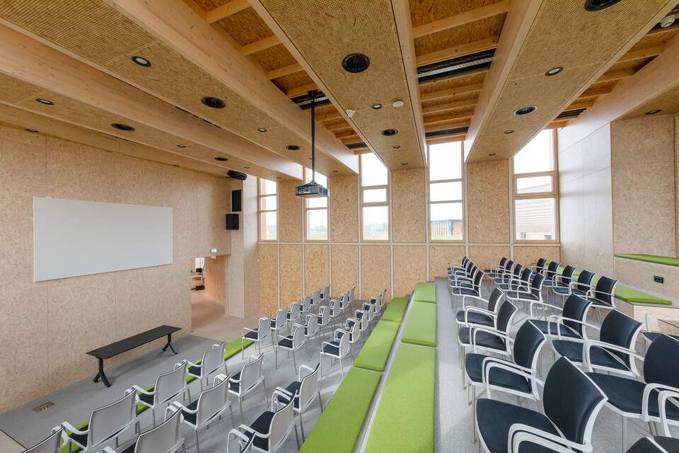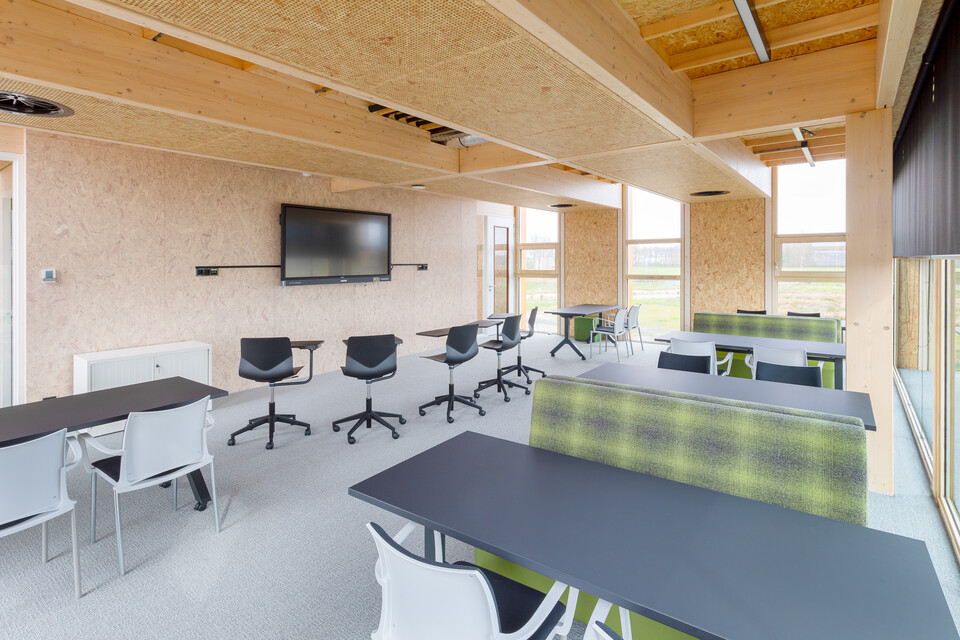 Ivo: ‘Bij de totstandkoming van zowel het gebouw als interieur hebben we zoveel mogelijk lokale partijen betrokken.’ Architectenbureau Paul de Ruiter ontwierp de duurzame blikvanger die prachtig is ingebed in de natuurlijke omgeving. De totaalinrichting is in samenwerking verzorgd door projectstoffeerder Iedema, interieurbouwer Dengo en Gispen. Op basis van een interieurontwerp van Alice Tabak, werkzaam vanuit de vestiging van Gispen in Groningen.