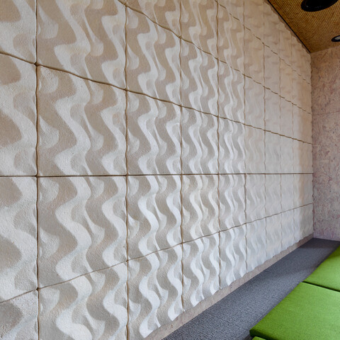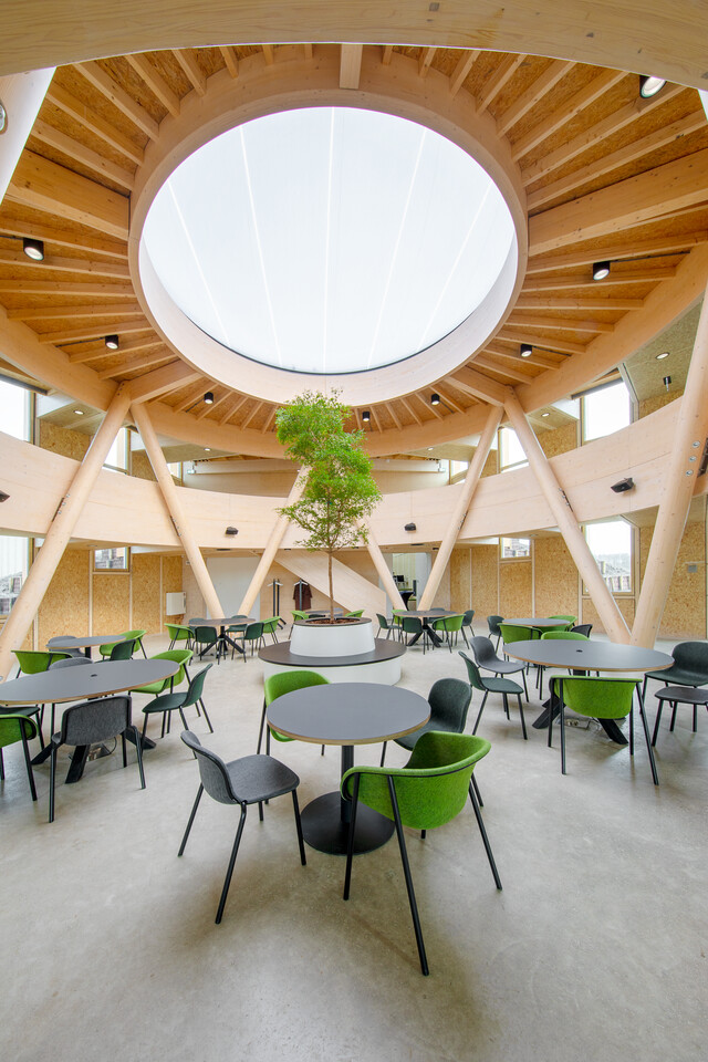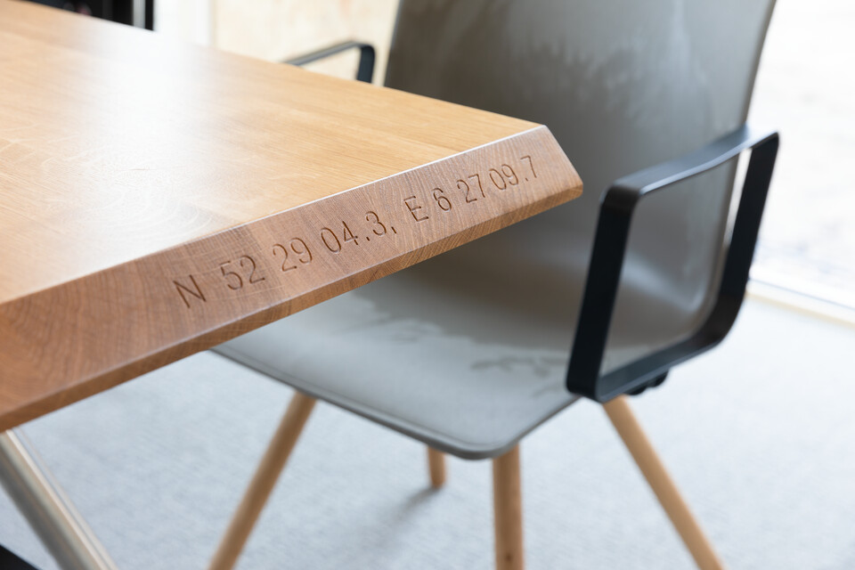 Een mooi voorbeeld van de toepassing van biobased materialen zijn de vergadertafels. Voor de frames zijn oude bureaus van de wethouders van de gemeente Ooststellingwerf gebruikt, voorzien van massieve eikenhouten bladen van Woudhout©. Dit is afkomstig uit door Natuurmonumenten beheerde bossen in Nederland en Duitsland. Alice: ‘Leuk detail; in de rand van de tafelbladen zijn de coördinaten ingefreesd van de plek waar de gebruikte bomen stonden.’ Een ander biobased product zijn de akoestische panelen aan de wanden van het Atrium, samengesteld op basis van mycelium (ofwel schimmeldraden). Circulaire producten zijn onder meer stoel Nomi met gerecyclede kunststof kuip, kledinghangers van oude Volkern bureaubladen en het toegepaste tapijt, Desso Airmaster Sphere dat cradle tot cradle-gecertificeerd is.
