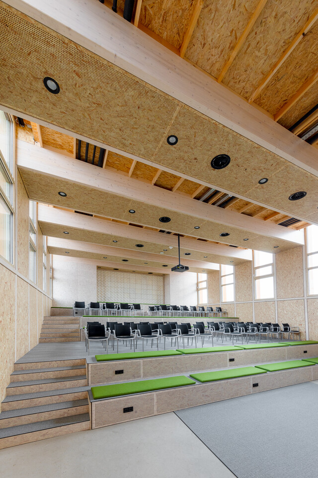 Bij binnenkomst in het Atrium, de centrale ontmoetings- en overlegruimte, is direct een divers landschap te zien van zitplekken en overlegmogelijkheden. Blikvanger is de centrale boombank, gerealiseerd in samenwerking met studenten van ROC Friese Poort Drachten en Dengo Oosterwolde. Rondom staan setjes van ronde Gispen Dukdalf tafels en De Vorm LJ Viltstoelen van gerecyclede PET-flessen. Verderop in de open ruimte staan grote, comfortabele Pod Chairs van De Vorm, die dankzij de wangen extra privacy bieden. Ook zijn er hoge krukken toegepast aan een bar. Zo zijn verschillende manieren van zitten en een gesprek voeren mogelijk. Op de begane grond bevinden zich verder een grote congresruimte inclusief podium, ook in te zetten voor gastcolleges aan studenten. Daarnaast zijn er vergaderruimtes, beschikbaar voor het bedrijfsleven.