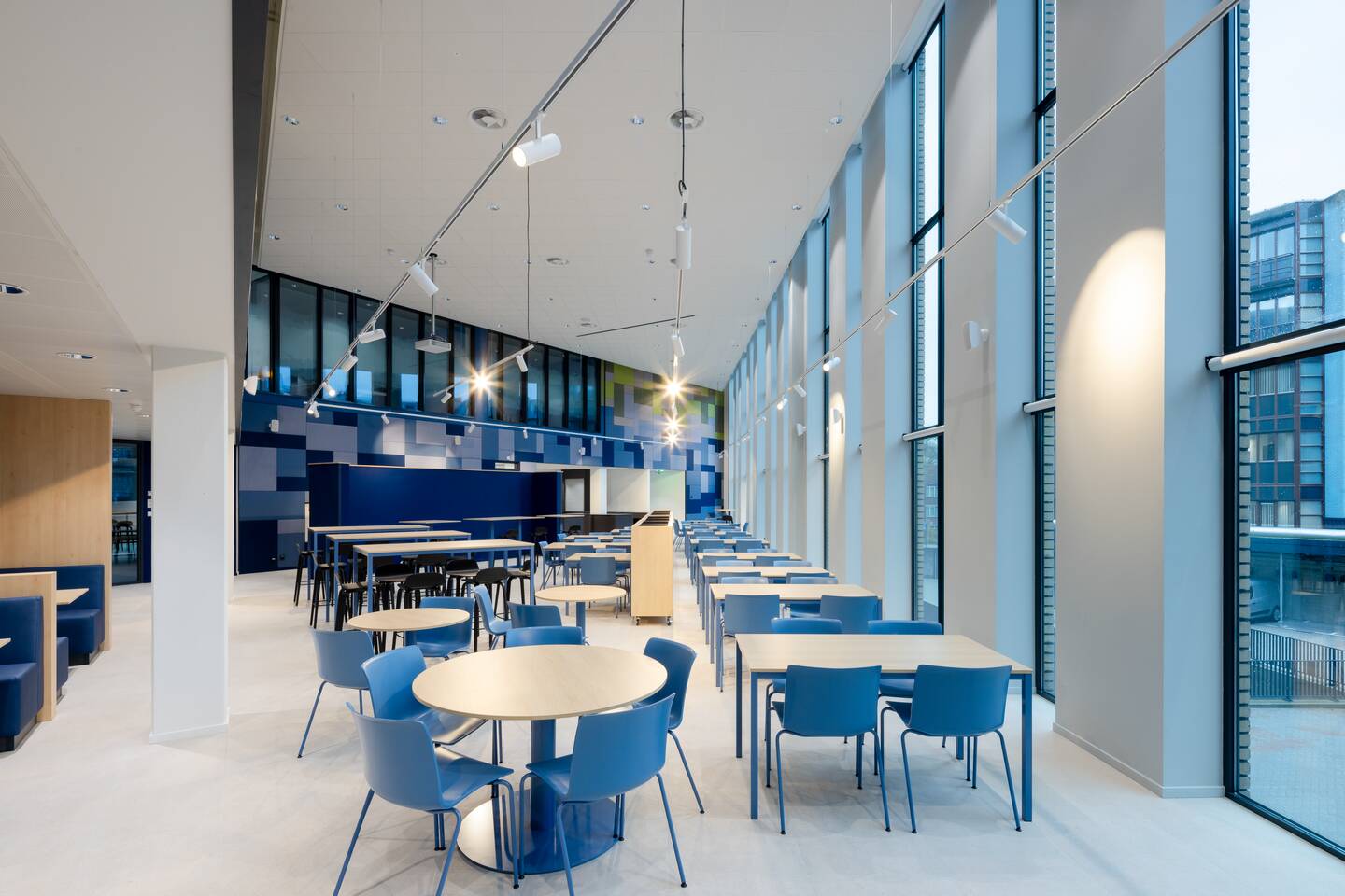 Michelle Zwiers, interieurarchitect bij Gortemaker Algra Feenstra, licht toe: ‘Een eigen identiteit voor verschillende soorten gebruikers was een belangrijk uitgangspunt bij het ontwerp. Vanuit de huisstijlkleuren hebben we voor politiebureau Hilversum een breder kleurenspectrum gecreëerd: van donkerblauw, turquoise en fris blauw tot groen. Door op de afzonderlijke verdiepingen verschillende kleurstellingen te gebruiken, ontstaat er herkenbaarheid maar ook een eigen identiteit en dynamiek. In het restaurant op de eerste verdieping, waar iedereen welkom is, komen alle kleuren samen op een grote akoestische wand, een echte eyecatcher.’
