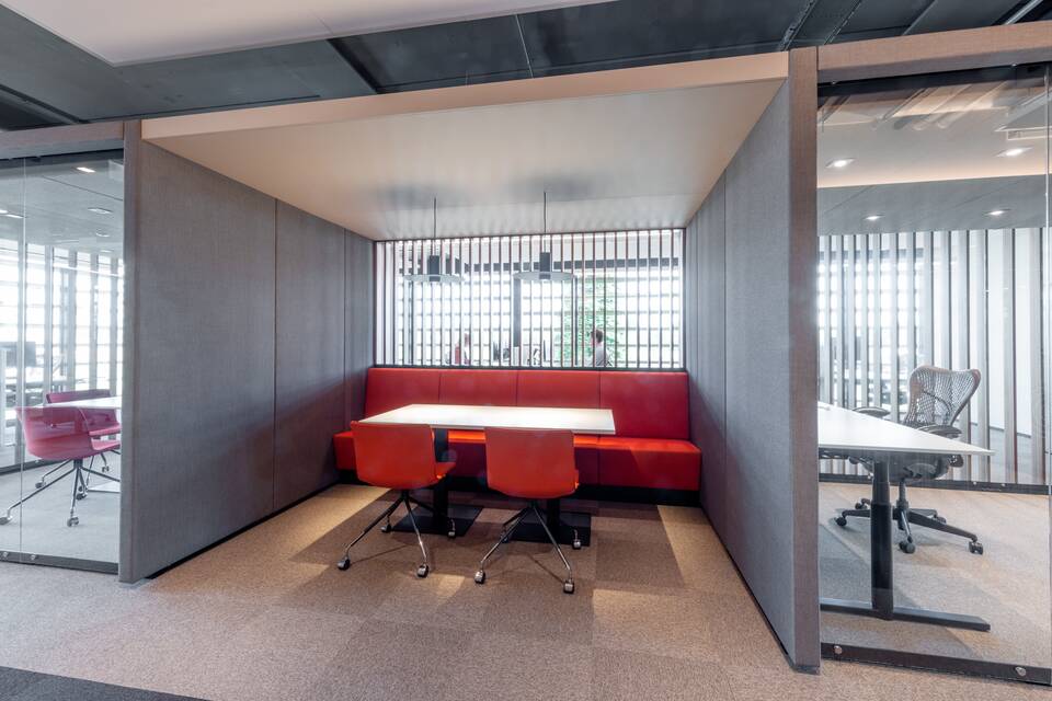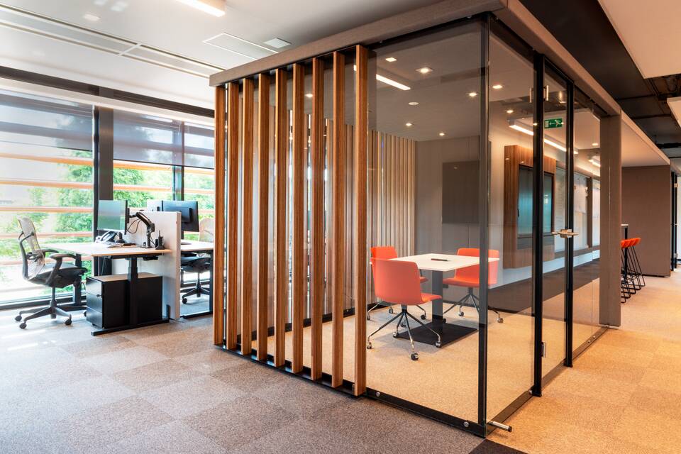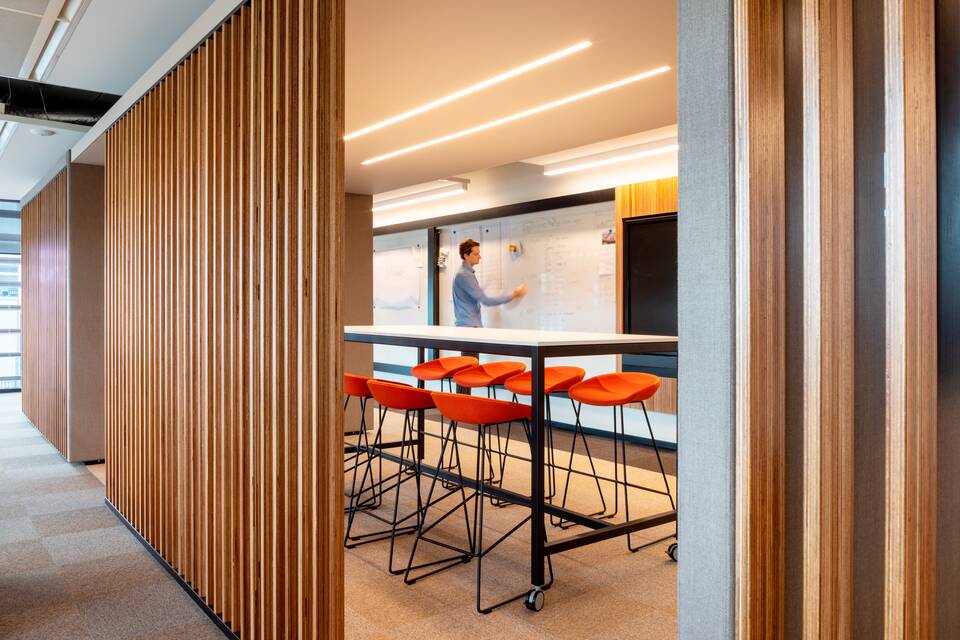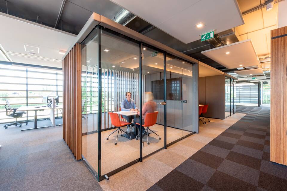 Marius Rutges: “We merken hoe fijn mensen het vinden om collega’s weer te ontmoeten. De inrichting draagt daartoe bij, met een bedrijfsrestaurant met bar voor informeel bijpraten en MOXX van Gispen voor vergaderingen. Gispen heeft samen met Het Woud de MOXX-boxen helemaal op ons afgestemd door hergebruik van Plexwood. Wij zijn heel tevreden en krijgen ook van klanten positieve reacties op onze nieuwe ruimtes.”