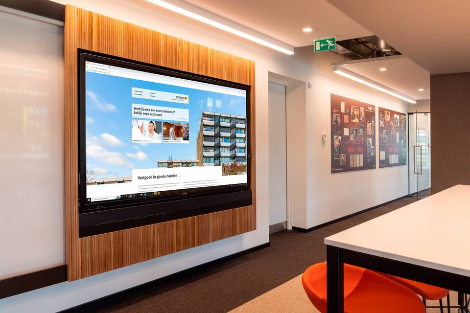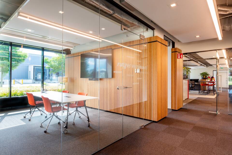 Bij de herinrichting viel op hoe goed de kwaliteit van het interieur uit 2008 nog was. We hebben zo veel mogelijk hergebruikt. Uniek aan de MOXX-ruimtes voor Rutges Vernieuwt is het hergebruik van Plexwood. In de vorige inrichting was Plexwood gebruikt voor onder meer kastombouwen. Het Woud heeft meegedacht hoe we dit opnieuw konden verwerken, want het was echt zonde om het weg te gooien. Het zijn lamellen geworden die tegen de glazen wanden van de MOXX zijn geplaatst. Dankzij deze verticale lamellen krijgen de boxen een unieke en warme uitstraling, die past bij de kwaliteit van Rutges Vernieuwt.