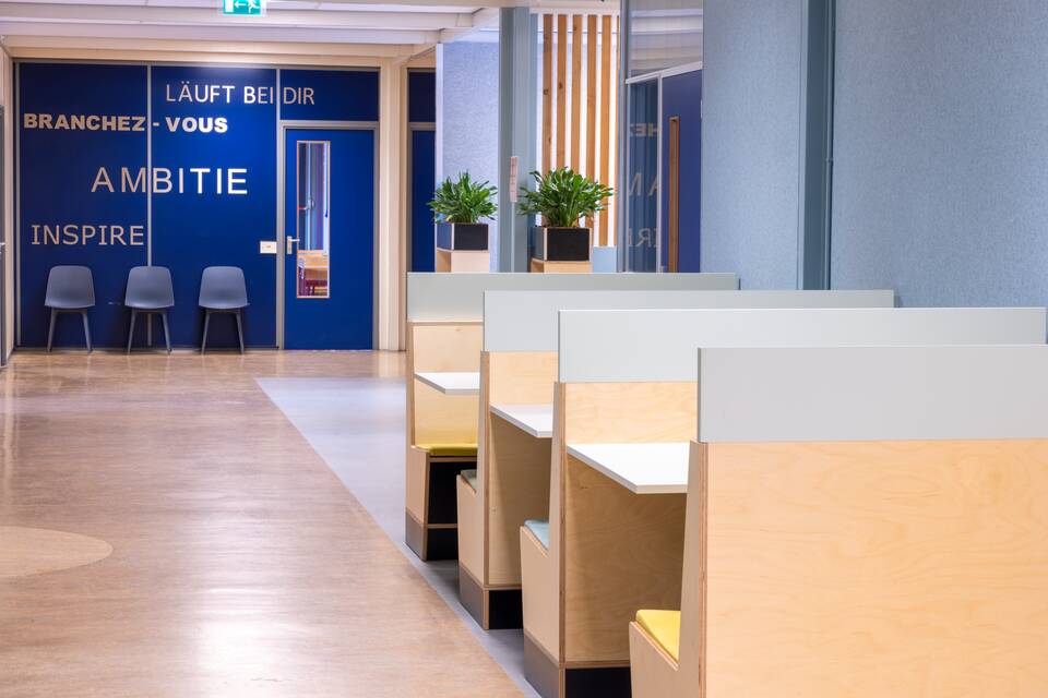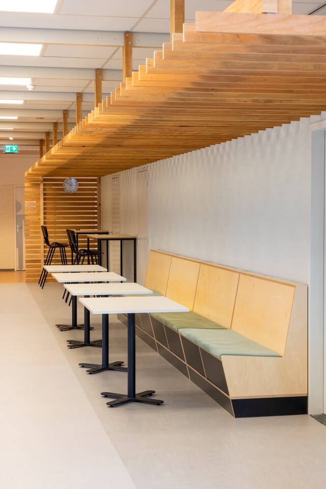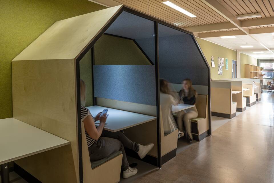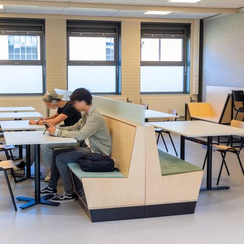 De architecten van KeK ontwierpen de nieuwe WerkLeerCentra en specificeerden het gewenste meubilair. Op basis van een tender werd Gispen de opdracht gegund. Belangrijke uitgangspunten waren duurzaam meubilair en leerlingproof materialen. Rob: ‘Zo zie je binnen het onderwijs regelmatig opstellingen met treinbanken. Voor het Assink Lyceum maakten we maatwerk treinbanken van beton- en multiplexmateriaal. Degelijk en onverwoestbaar.’ Lachend: ‘Ik durf er mijn hand voor in het vuur te steken dat deze treinbanken minstens twintig jaar goed blijven. Voor het zitcomfort voorzagen we ze van speciale uitwasbare kussens.’ Groepjes leerlingen kunnen ook samenwerken aan lage ronde Gispen Kolm tafels, met daaromheen stoelen waarvan de zitting is gemaakt van gerecyclede petflessen. Er is een grote variatie aan zitoplossingen om uit te kiezen. Naast de treinbanken en lage tafels kunnen de leerlingen en medewerkers gebruikmaken van lange banken of de op maakt gemaakte hoge tafels (1.05 meter) met bijpassende hoge krukken.