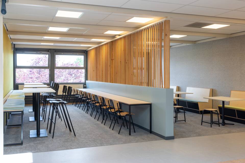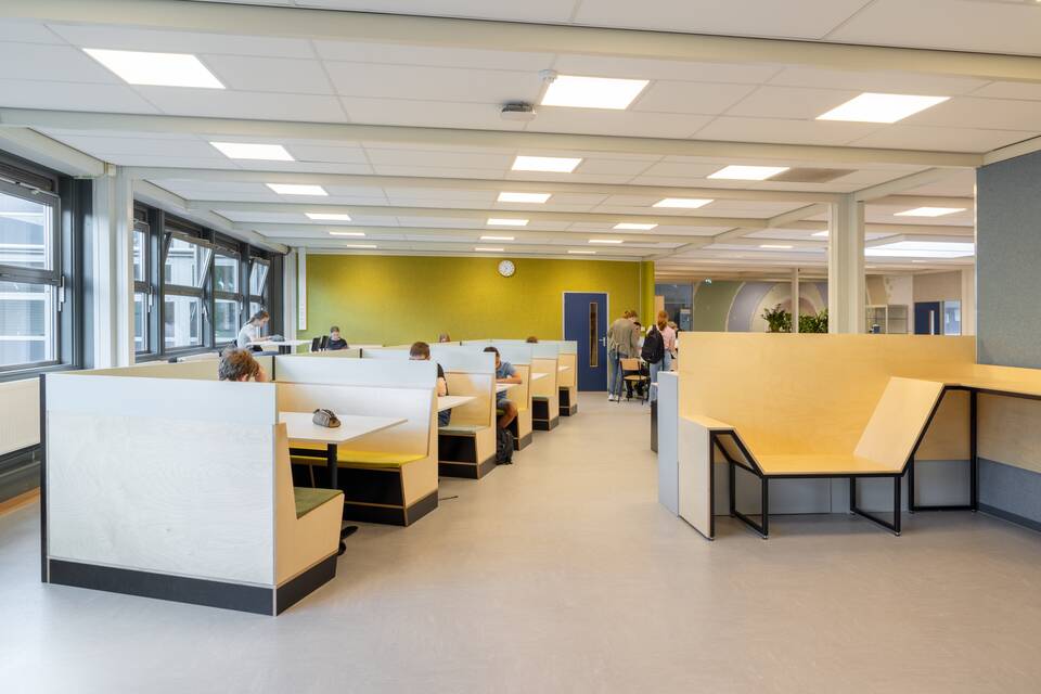 Vanwege leverproblemen met grondstoffen kon niet al het meubilair op tijd geleverd worden. In samenwerking met partner Alvero Kantoormeubelverhuur plaatste Gispen tijdelijk huurmeubilair. Rob: ‘Een mooi voorbeeld van denken in oplossingen. Dat hebben we continu gedaan in nauw overleg met Paul Sak, ons eerste aanspreekpunt bij de Technische Dienst van de school.’ Paul: ‘Door corona en de oorlog in Oekraïne hadden we pech met de leveringen. Toch kijk ik, juist door de nauwe samenwerking, terug op een goede uitvoering van dit project. Rob en ik hebben veel contact gehad, dat werkte heel prettig.’
