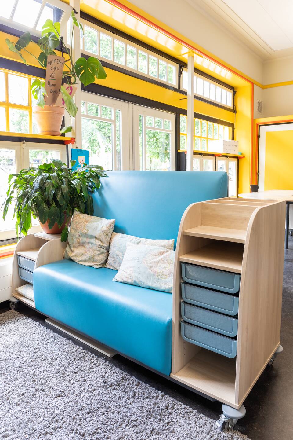 In een clusteropstelling van groepjes van vier kunnen 16 leerlingen samenwerken op één hoogte. Het is daarnaast ook mogelijk om aan de Adjust Tables zittend of staand te overleggen in een groepje van vier. Aan de Pacmantafel kunnen de leerlingen de instructielessen van de leerkracht volgen. Ook is er een leuke zithoek met zitbankjes met verrijdbare bakken. Dit is perfect voor het kringgesprek.