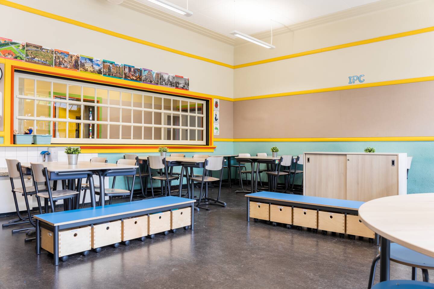 De groepen 3 en 4 beschikken net als de andere leerlingen in hun lokaal over de ‘Inline’ kastenwand met daarin de kleurrijke limegroene Gratnell lades. Een kastenwand die rust uitstraalt en één is met het gebouw. Ook hier zijn de leerlingsets zo opgesteld dat er in groepen gewerkt kan worden. Maar er kan ook snel en makkelijk van opstelling veranderd worden voor bijvoorbeeld het kringgesprek. De leerkrachten hebben – zoals ook in de andere lokalen - een eigen bureau met een ergonomische Ray-Swivel. Deze is verrijdbaar en in hoogte verstelbaar.