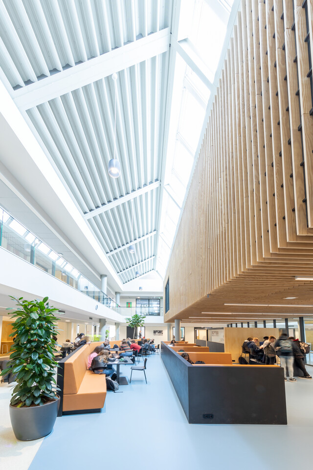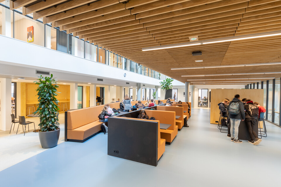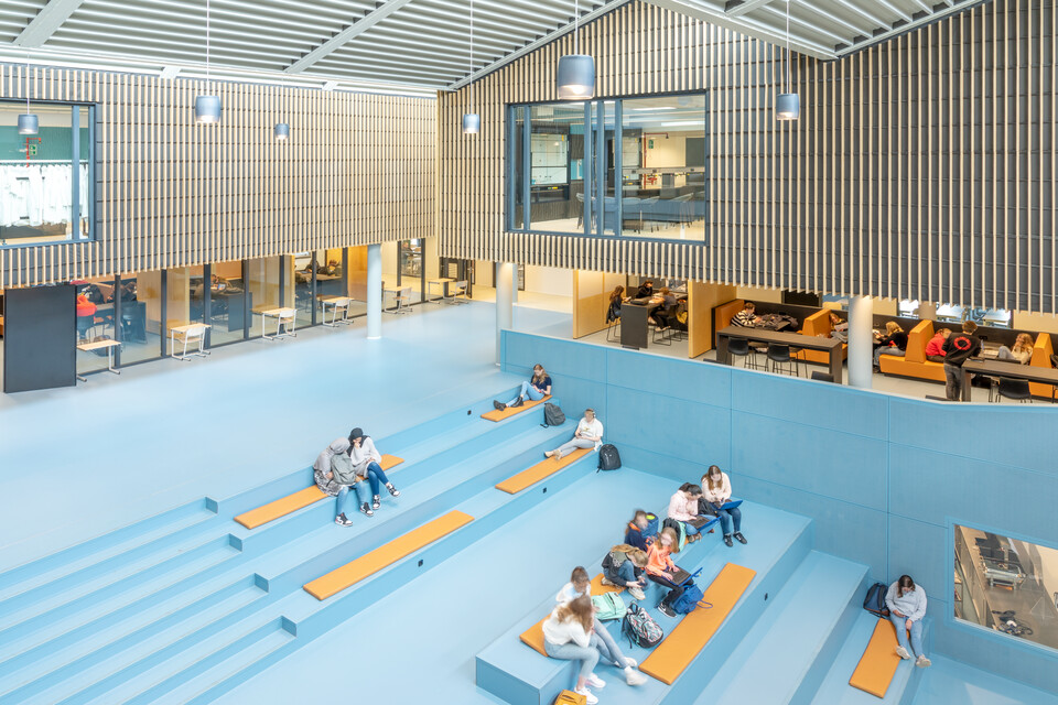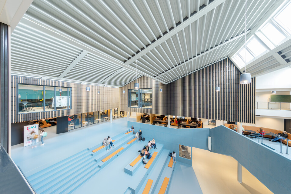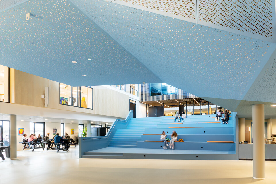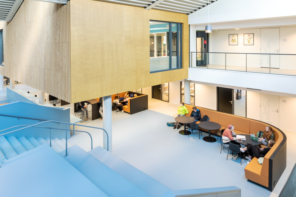 Een belangrijk uitgangspunt was flexibiliteit in het gebouw: ‘Elk domein binnen ons onderwijs heeft eigen leslokalen en kan daarnaast gebruikmaken van een leerplein. Elk leerplein biedt ruimte aan diverse werkvormen en projectwerk. We zochten naar een flexibele en multifunctionele indeling en inrichting. Ook voor het nieuwe atrium.’ Het bestaande gebouw uit 1968 is letterlijk en figuurlijk opengewerkt en tussen de bestaande flanken is een atrium ontstaan. Op deze open en lichte plek komt de dynamiek van het onderwijs het best tot zijn recht: er zijn leer- en werkplekken, op de trappen kunnen leerlingen en docenten elkaar ontmoeten of informeel bijpraten, er is ruimte voor voorstellingen, ouderavonden, bijeenkomsten. Jeroen van den Berg: ‘Het atrium is het sociale hart van onze school. Ik ben er best trost op dat we samen dit mooie resultaat hebben bereikt.’