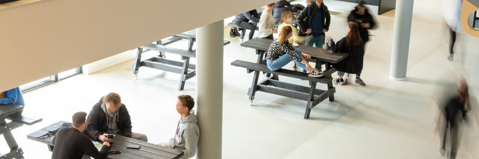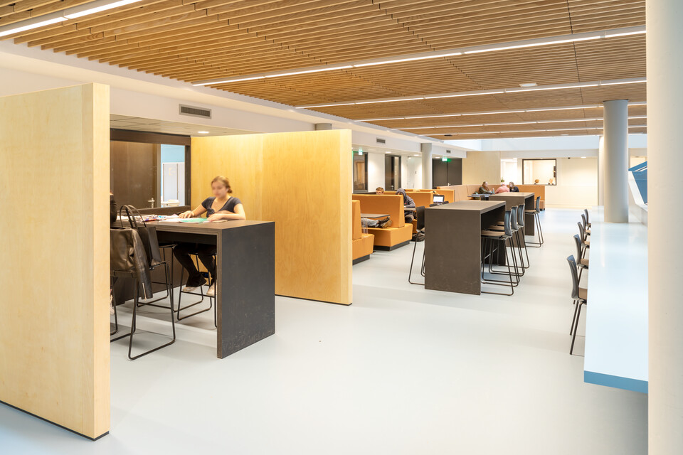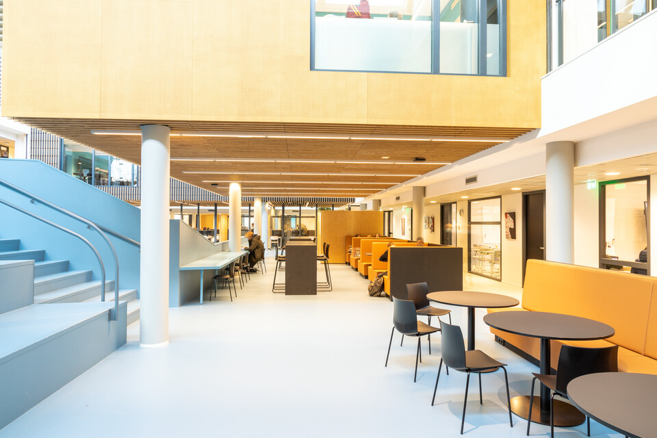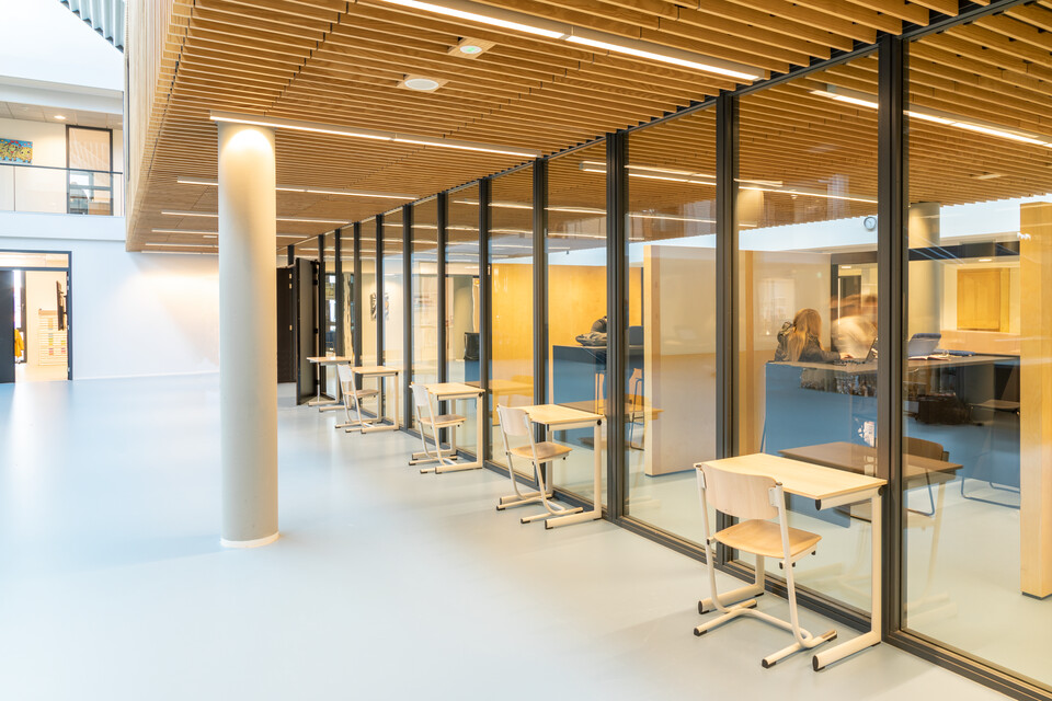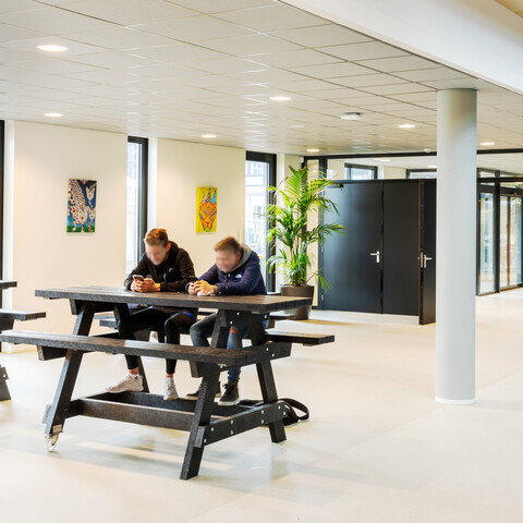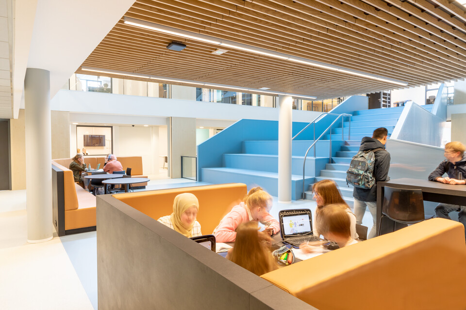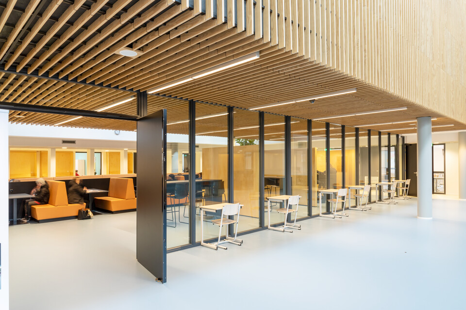 Een belangrijk uitgangspunt was flexibiliteit in het gebouw: ‘Elk domein binnen ons onderwijs heeft eigen leslokalen en kan daarnaast gebruikmaken van een leerplein. Elk leerplein biedt ruimte aan diverse werkvormen en projectwerk. We zochten naar een flexibele en multifunctionele indeling en inrichting. Ook voor het nieuwe atrium.’ Het bestaande gebouw uit 1968 is letterlijk en figuurlijk opengewerkt en tussen de bestaande flanken is een atrium ontstaan. Op deze open en lichte plek komt de dynamiek van het onderwijs het best tot zijn recht: er zijn leer- en werkplekken, op de trappen kunnen leerlingen en docenten elkaar ontmoeten of informeel bijpraten, er is ruimte voor voorstellingen, ouderavonden, bijeenkomsten. Jeroen van den Berg: ‘Het atrium is het sociale hart van onze school. Ik ben er best trost op dat we samen dit mooie resultaat hebben bereikt.’