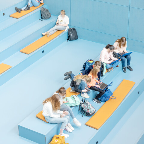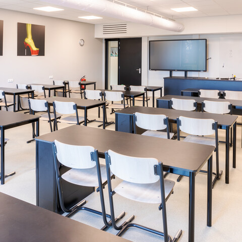 Na een Europees aanbestedingstraject en enkele proefopstellingen kreeg Gispen de opdracht. Jeroen Ideler, Senior Business Manager bij Gispen: ‘Samen met gebruikers zijn we voor het meubilair op zoek gegaan naar een goede balans tussen functie, comfort, uitstraling, onderhoud en de individuele wensen van leraren en leerlingen. Ook facilitaire wensen hebben we meegenomen, zoals de mogelijkheid om stoelen eenvoudig te stapelen of te verschuiven zonder beschadigen van de vloer.’ In de klaslokalen staan lessets van Presikhaaf, uiteraard met goede doppen onder het meubilair. Voor de docentwerkplekken en kantoren koos het lyceum solo- en duo-bureaus uit de Gispen TMNL meubellijn, aangevuld met de ergonomische en zeer comfortabele ZINN bureaustoel. In de aula plaatsten we koppelbare zaalstoelen: de Casala Lynx.