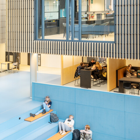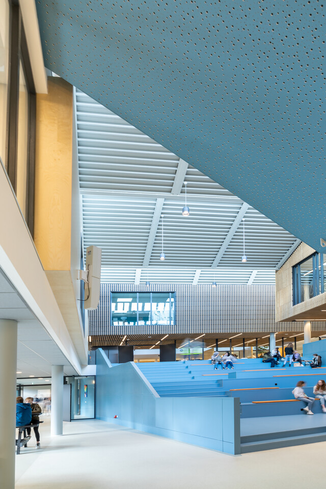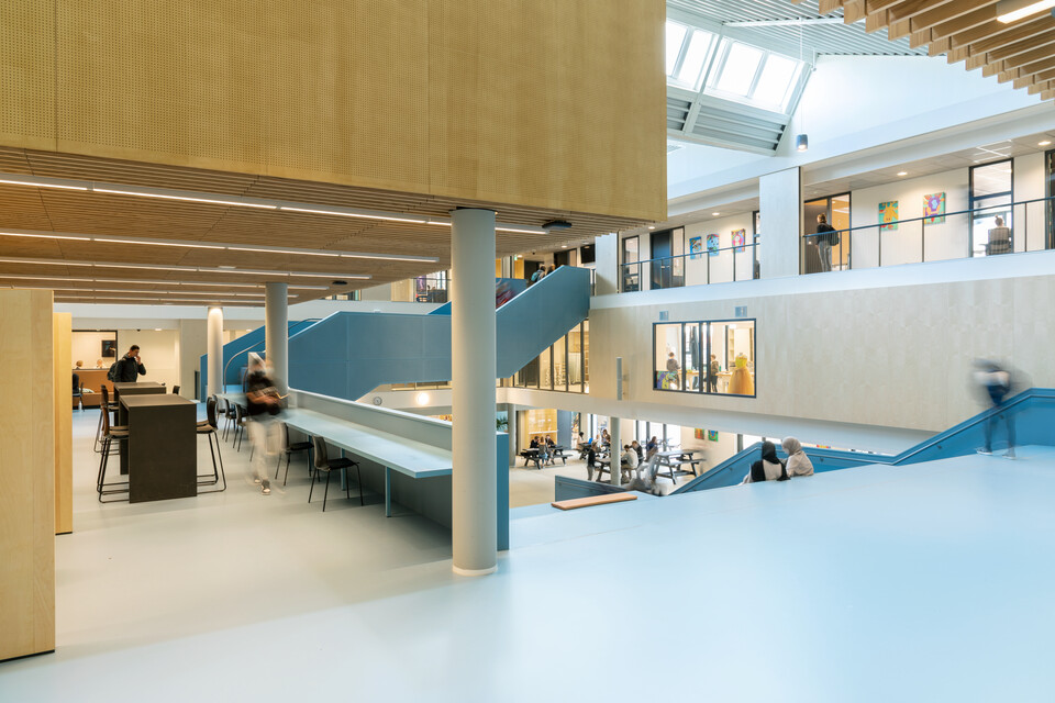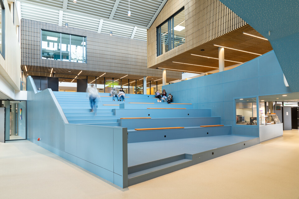 Interieurarchitect Odette Ex: ‘Samen met NOAHH hebben we gekozen voor een zeer open architectuur. Waar je tegenwoordig vaak een houten tribunetrap ziet als functionele verbinder tussen begane grond en de verdiepingen erboven, wilden wij het atrium juist een geheel eigen kleur en karakter geven. Daarom kozen we voor een beeldbepalende trap in petrol blauw die als een sculptuur naar boven loopt. De vloeren draaien mee, van begane grond tot en met de tweede verdieping. Rondom deze sculpturale trap bevinden zich alle leerpleinen. Deze zijn, net zoals de rest van het gebouw, in de basis bewust neutraal gehouden zodat de trap de blikvanger vormt. Bijpassende accentkleuren komen terug in de vloeren en wanden van de klaslokalen, uitgevoerd in lichtere blauwtinten. Het gekozen meubilair sluit aan op deze omgeving.’