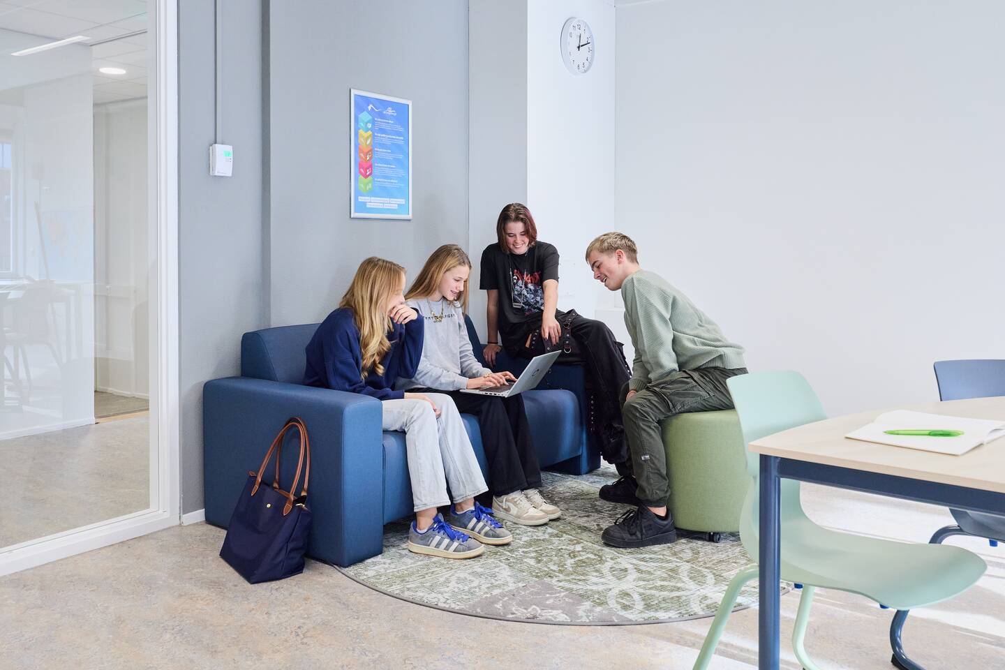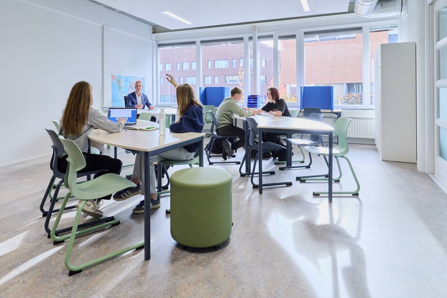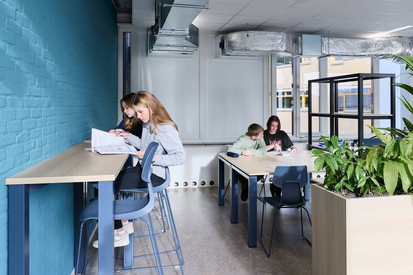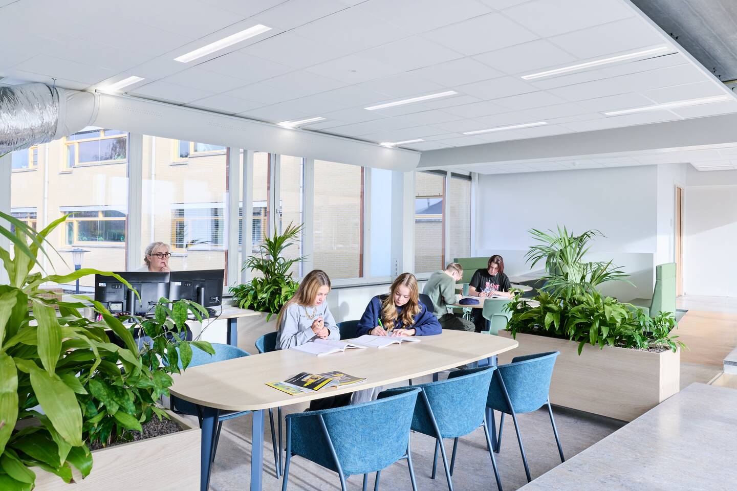 Accountmanager Harold Hermans: ‘De gewenste activiteiten hebben we ondergebracht in onderscheidende zones. In de concentratiezone staan werkplekken met een hoge zit- of sta-positie, voor individueel en gezamenlijk werk. We plaatsten ook individuele en samenwerkplekken op bureauhoogte, voorzien van akoestisch dempende schermen zodat de onderlinge rust gewaarborgd blijft. In de ontspannen zone vind je een huiselijke zithoek met banken, hockers en vloerkleed. In treinzitjes kunnen groepjes leerlingen actief en ontspannen samenwerken. Ze kunnen ook terecht aan ronde Gispen KOLM tafels met duurzame Gispen WIZZ stoelen. Ook duurzaam zijn de comfortabele OMEGA III stoelen met een vilten schaal van gerecyclede PET-flessen. En we brachten de natuur naar binnen: overal staan verrijdbare Gispen plantenbakken met groen.’