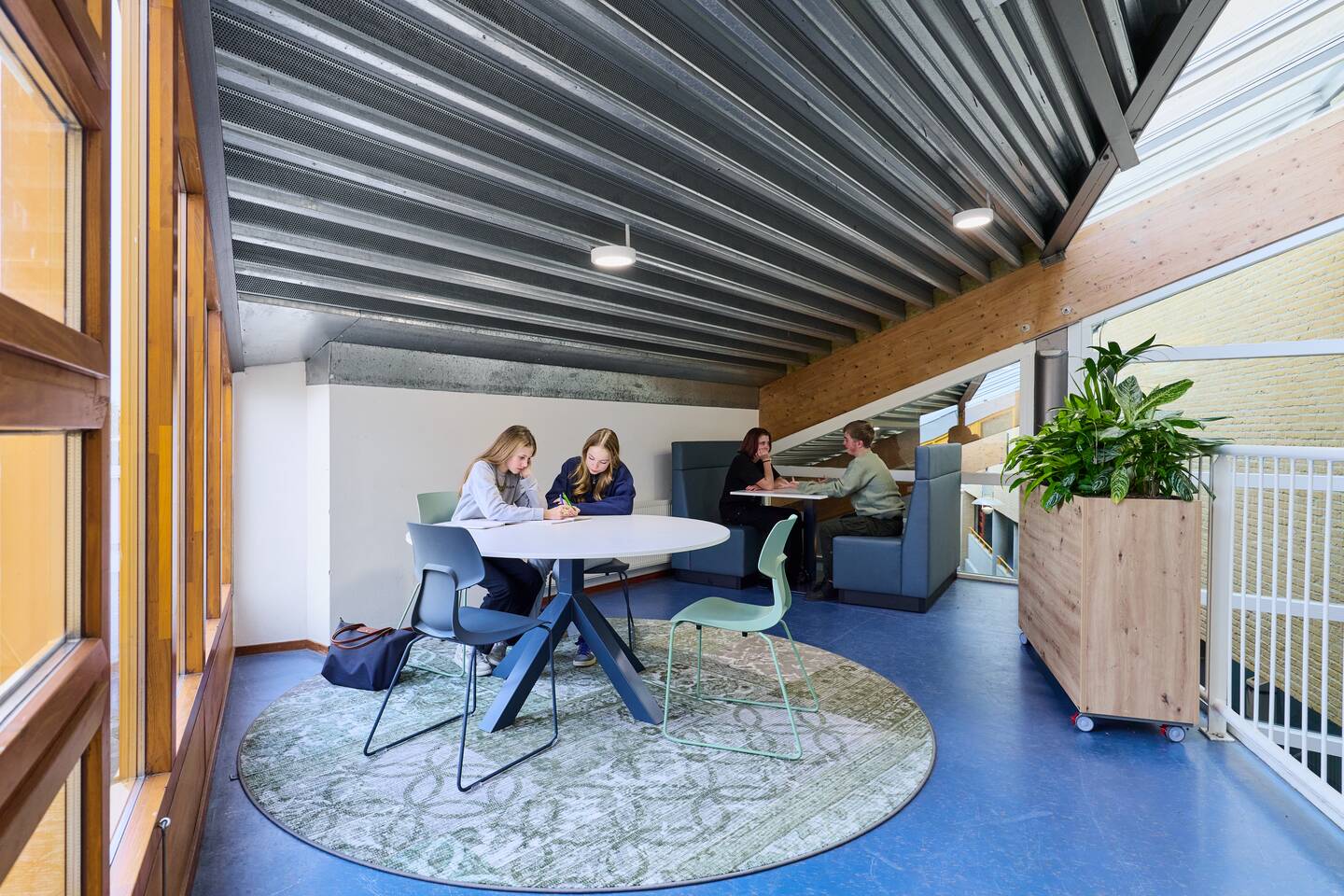 Op een andere verdieping richtten we een bibliotheek in die leerlingen motiveert om te lezen. Het is een groot leesplein geworden met ruimte voor 30 leerlingen, zodat docenten er ook gebruik van kunnen maken voor lessen. Duidelijke zichtlijnen worden afgewisseld met knusse hoekjes. Ook hier zijn veel houtdecoren en planten te zien. Om eenheid te creëren, trokken we dat door naar het studieterras, een betekenisvolle ruimte waar leerlingen volop keuze hebben uit studieplekken. Van treinopstelling tot eigen tafel. Een groot vloerkleed en kleine poefjes zorgen voor een huiselijke sfeer.
