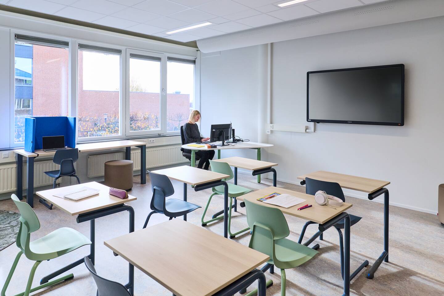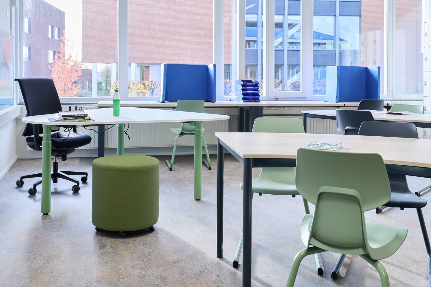 Achter in De Passage bevinden zich vier ruimtes die ook volledig zijn ingericht voor leerlingen die extra ondersteuning nodig hebben. Dankzij vloeiende vormen en natuurlijke, rustige kleurstellingen zijn prikkelarme ruimtes ontstaan. Harold: ‘We plaatsten organisch gevormde tafels die los te plaatsen zijn, of in een andere opstelling een andere dynamiek creëren in de klas. Voor de docent plaatsten we de Gispen TM Doc, een bureauopstelling die door zijn specifieke vorm samenwerken met leerlingen ondersteunt. De docent kan er ook staand aan werken. Deze tafel, die niet veel ruimte inneemt, wordt veel toegepast in ziekenhuizen. Bij de Lingeborgh is dus een mooie kruisbestuiving te zien tussen onderwijs en zorg.’