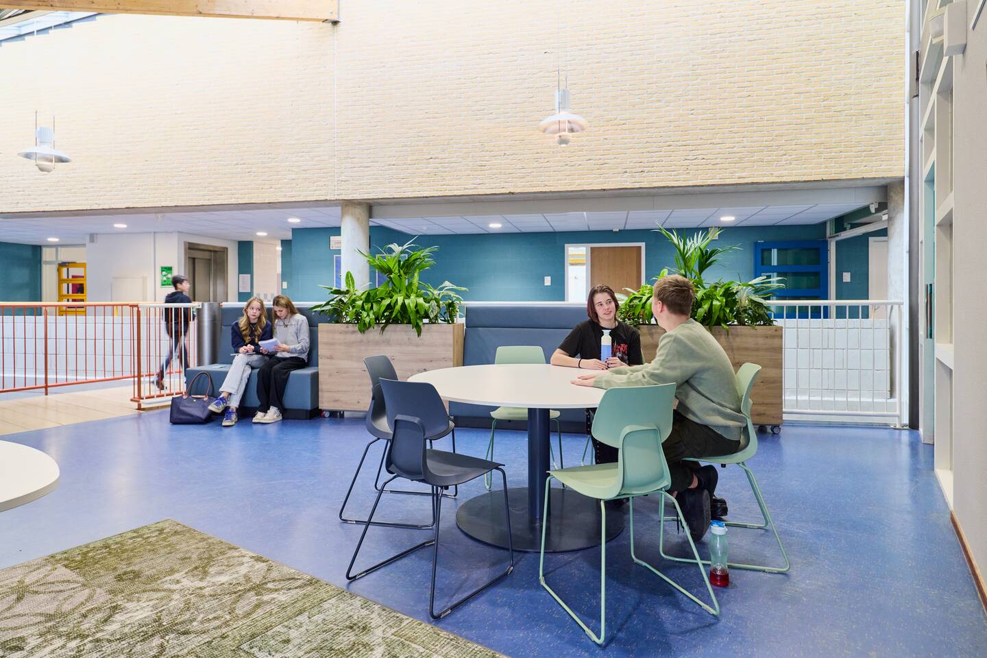 Grote aanwinst voor de middelbare school is De Passage: een uitnodigende ruimte waar leerlingen die even vastlopen terecht kunnen. Omdat ze overprikkeld zijn bijvoorbeeld, moeite hebben met plannen, zorgen thuis hebben, of de klas uit zijn gestuurd. Linda: ‘Alle extra ondersteuning die we voorheen op verschillende plekken boden, zit nu op één centrale vleugel bij elkaar. Van ambulant begeleiders tot schoolmaatschappelijk werk, van medewerker HALT tot schoolarts.’ Aan Gispen de vraag om De Passage zo in te richten dat allerlei werkvormen mogelijk zijn.