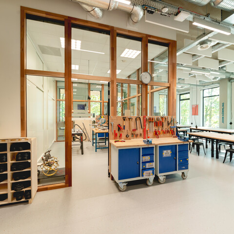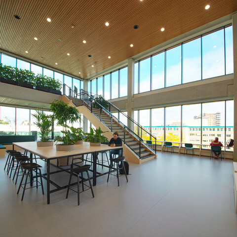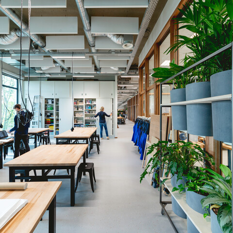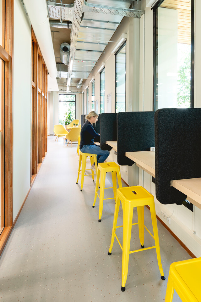 Ector Hoogstad Architecten verzorgde het interieurontwerp. Claartje ten Have van Studio Moj, vaste partner van Gispen, vertaalde dit ontwerp verder door in kleurstellingen, materialen en toegepaste producten. Qua meubilair baseerden we ons op de basisafspraken met Fontys, zodat de uniformiteit en eenheid tussen verschillende onderwijsgebouwen geborgd is. Uiteraard is al het meubilair studentproof. Projectleider Lieke van Casteren: ‘Het oude gebouw van ICT is gesloopt. Op locatie hebben we al het meubilair gecontroleerd en bekeken wat opnieuw inzetbaar was. Bijvoorbeeld de scrumtafels. We voorzagen bestaande treinbanken van nieuwe stoffering. Vergadertafels zijn opnieuw gelakt en kregen nieuwe bladen.’ Voorbeelden van nieuw meubilair zijn onder meer de in hoogte verstelbare TM-bureaus met bureaustoel Zinn, Nomi en Triennial stoelen en Dukdalf kapstokken en tafels. Bijzonder zijn ook de Hale stoelen van De Vorm, gemaakt van gerecycled PET-vilt. Al het maatwerk meubilair – van wandmeubels en pantry’s tot plantenbakken – is afkomstig van Meubelmakerij Het Woud.