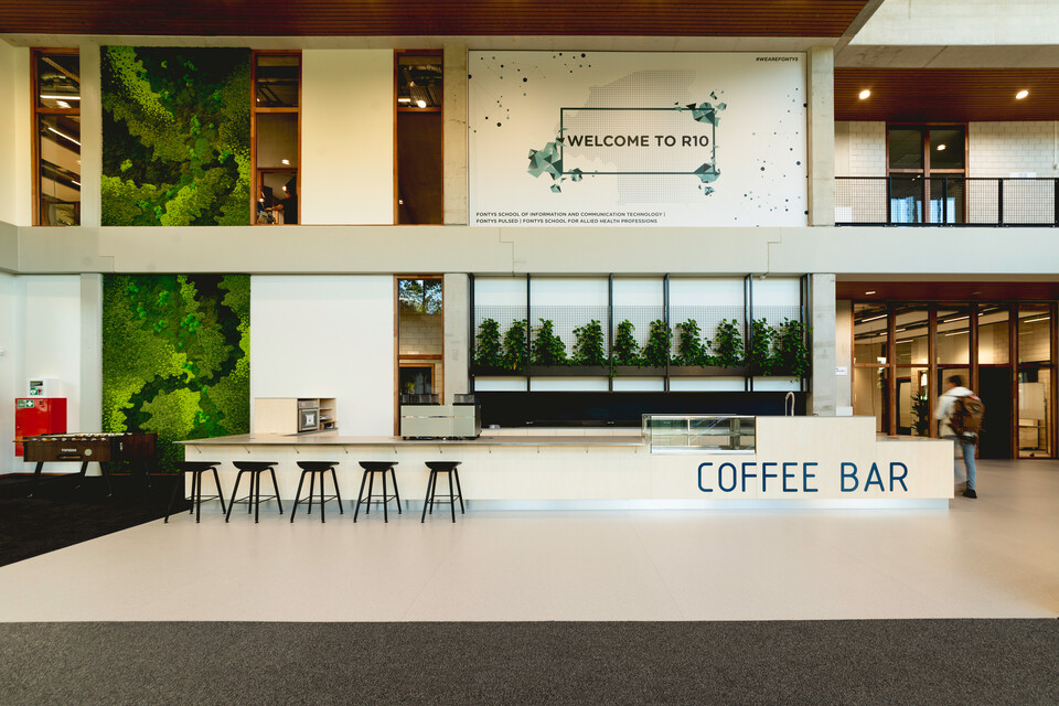 Op de vier verdiepingen van gebouw R10 vindt eigentijds en boeiend onderwijs plaats in een pand dat breed toegankelijk is. Fontys Hogeschool ICT (FHICT) is de hoofdgebruiker. Het nieuwe gebouw heeft een sterk eigen karakter. Het is een echte ontmoetingsplek die uitnodigt tot samenwerken en experimenteren. Dankzij de transparante gevels is het onderwijs goed te zien. Michel van der Zanden, senior projectleider Huisvesting en Facilitaire Zaken bij Fontys Hogescholen: ‘We wilden andere opleidingen graag laten zien wat hier binnen gebeurt en alles als het ware in een etalage plaatsen. Hier wordt dagelijks geïnnoveerd! Dat tonen we graag aan de buitenwacht, een mooie stimulans.’ FHICT had behoefte aan een gebouw waarin ze zogenaamde OIL’s konden uitrollen: grote Open ICT Labs. In deze open leeromgevingen wordt vernieuwend en innovatief onderwijs gegeven, vanuit de gedachte van activiteitgericht leren. Er zijn nu 13 OIL’s, elk circa 400 vierkante meter. In het nieuwe gebouw is ook de opleiding Pulsed gehuisvest. Studenten kunnen hier hun kracht ontdekken en zich in kort tijdsbestek zowel persoonlijk als professioneel ontwikkelen in het creatieve domein.