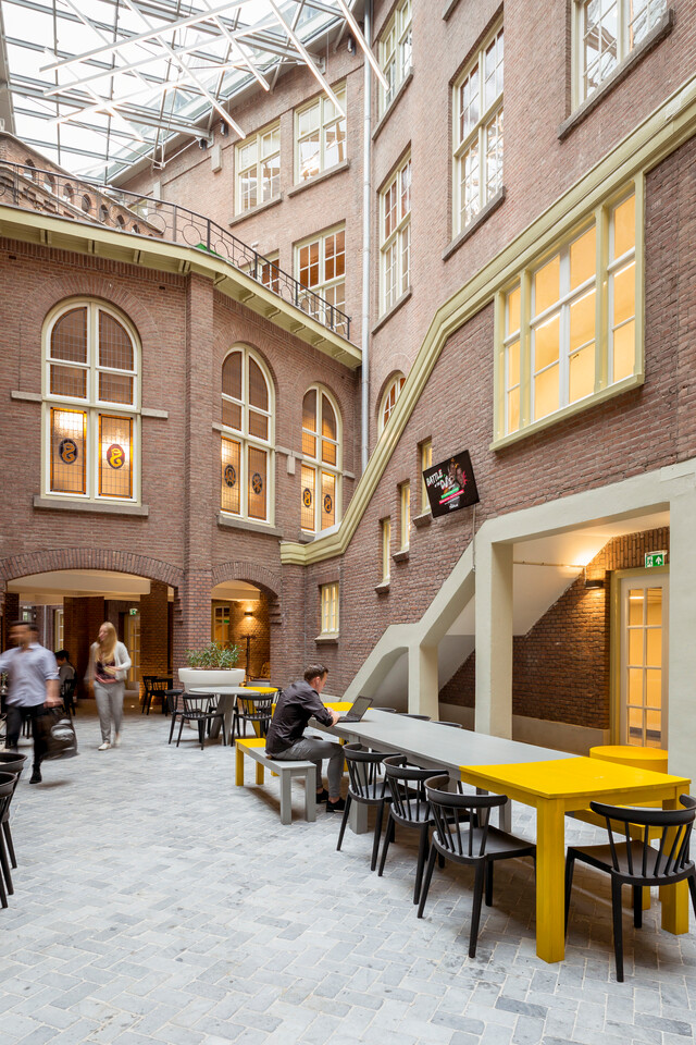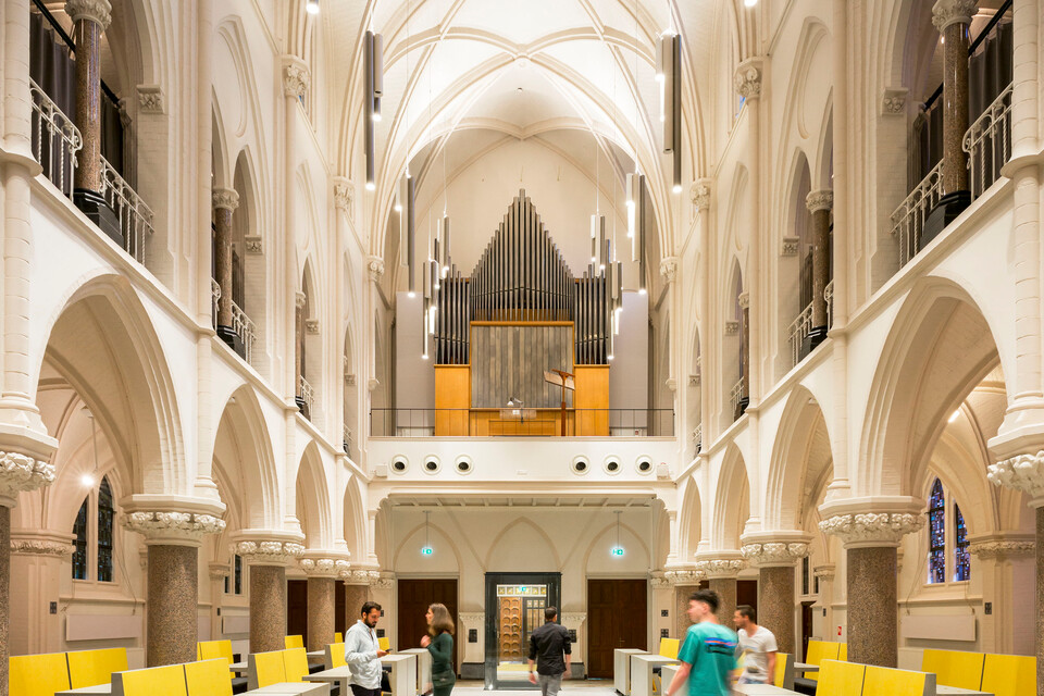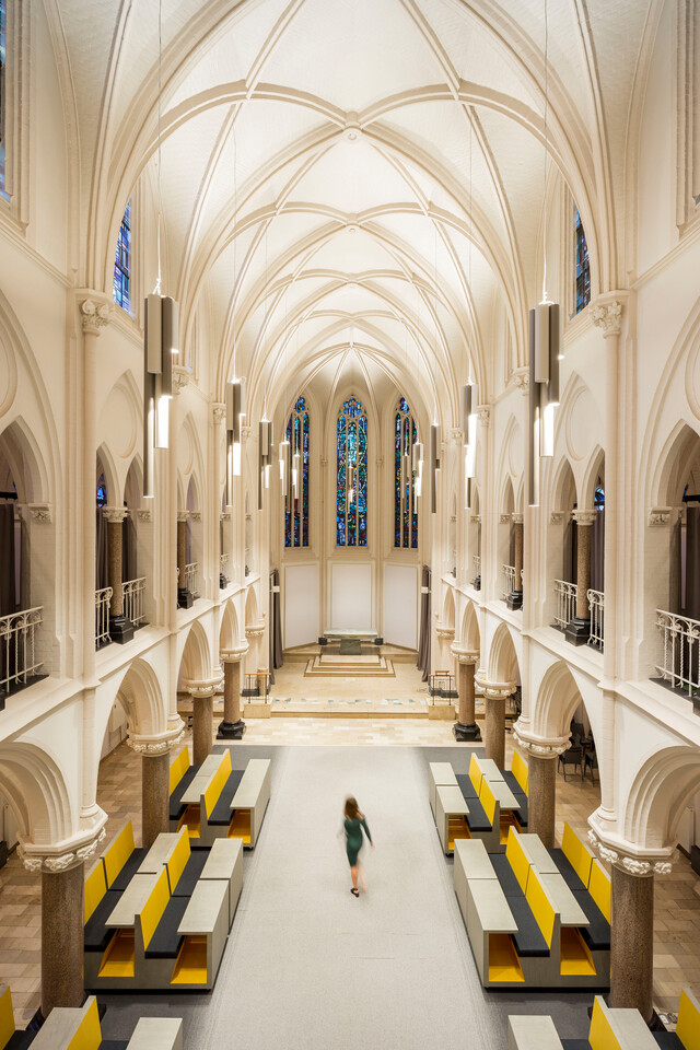 Architect Yvonne Segers: ‘De twee universiteiten wilden een nieuwe community creëren, met een geheel eigen identiteit. Qua huisvesting wilden we inhaken op het bestaande pand met een traditioneel kloostergevoel: een robuust en solide complex met terrazzo-vloeren, hoge plafonds en hoge ramen met uitzicht op de kloostertuin. Tegelijkertijd ging het hier om nieuwe gebruikers met een andere snelheid. We hebben continu de balans gezocht tussen de traagheid van de geschiedenis die het pand ademt, en het snelle en innovatieve van Data Science.’ Rob Allard, Business Manager bij Gispen: ‘Die mix van traditie en vernieuwing zie je overal terug, tot in het gekozen meubilair.’