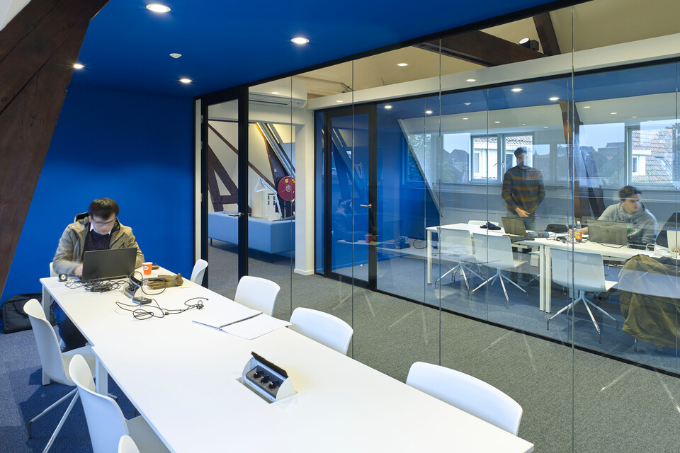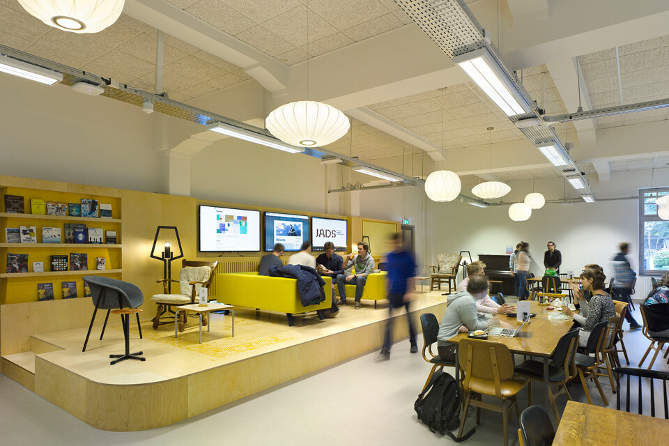 Het hoofdgebouw van JADS heeft diverse college- en instructiezalen. Deze zijn voorzien van tafels (Gispen UT) en stoelen, of er zijn stoelen met uitklapbare schrijfplankjes. Ook zijn er kleinere project- en overlegruimtes. Hier is stoel Nomi toegepast. Deze stoelenserie biedt veel mogelijkheden voor het creëren van een eigen identiteit, dankzij afneembare hoezen in verschillende kleuren. Want elke verdieping in het gebouw heeft een herkenbare eigen kleur. Leuk detail: de kleurenpaletten zijn gebaseerd op details uit schilderijen van Jeroen Bosch (‘Jheronimus’). In de kapel is een grote hoorzaal gecreëerd voor debatten en presentaties – indeling en inrichting zijn eenvoudig aan te passen. Naast alle onderwijsruimtes zijn er werkplekken voor staf en docenten en studie-eilanden voor de masterstudenten. Alle werkplekken – met TM duo-bureaus, Zinn bureaustoelen en schuifdeurkast SDK – zijn flexibel te gebruiken. Het hart van het gebouw wordt gevormd door JADS Plaza, waar men kan lunchen of elkaar treft voor een overleg. Bijvoorbeeld in een van de Sett banken.