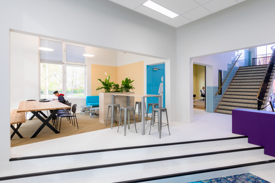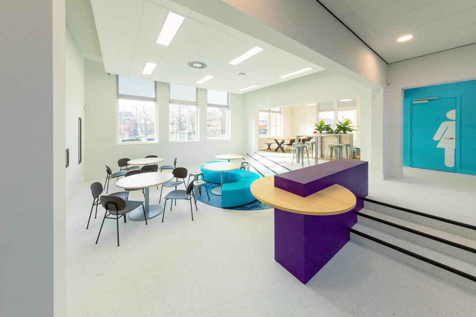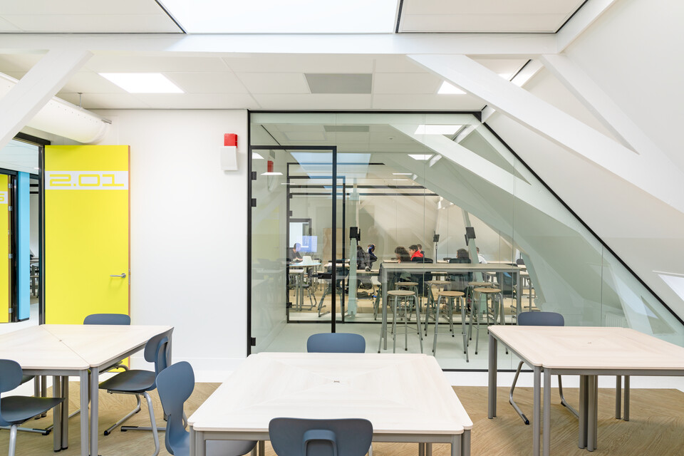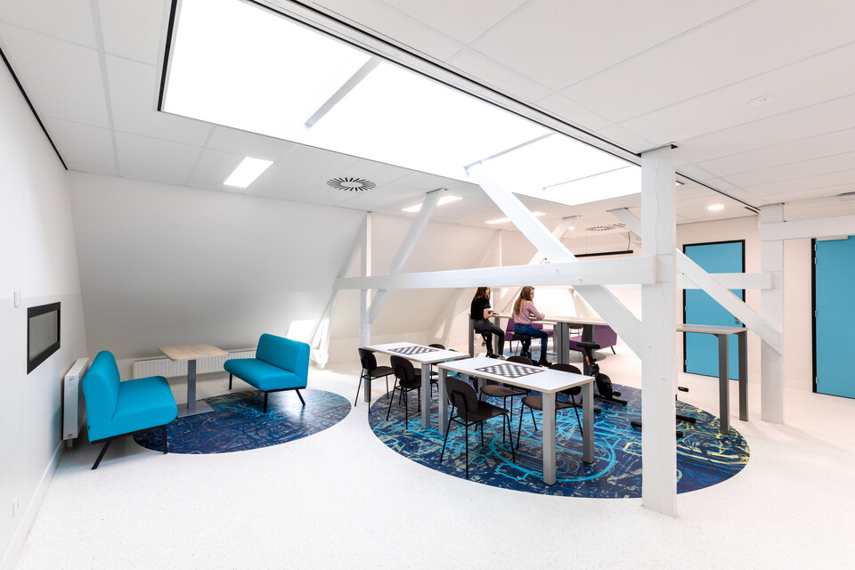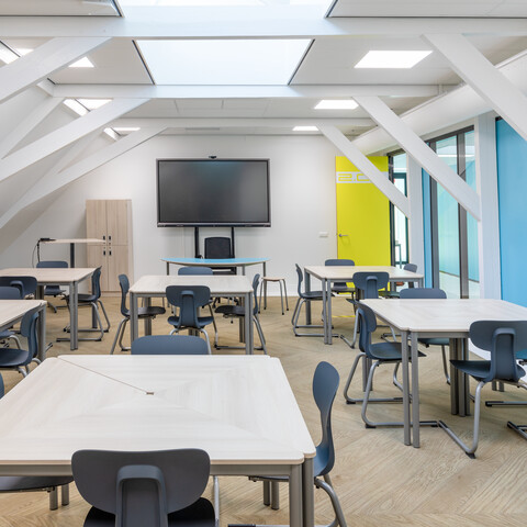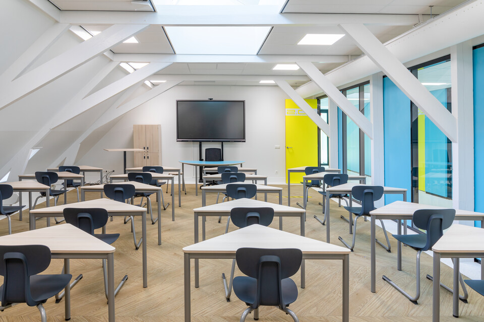 Interieurarchitect Annemieke Tijsseling van Presikhaaf Schoolmeubelen vertaalde het ontwerp inclusief hoofdkleuren van de architect naar inrichtingstekeningen. Zo laten de vloeren van de lokalen en grote leerpleinen een mooie afwisseling zien van marmoleum en een warme parketprint. Karpetten in aansluitende kleuren zijn slim toegepast om in het grote geheel losse plekken aan te duiden. Deze hebben meteen een akoestische werking. Robert Aret, onderwijsinrichtingsspecialist bij Presikhaaf Schoolmeubelen: ‘In de zolderruimte hebben we bewust gekozen voor verschillende soorten hoge en lage meubels, statafels of juist lekkere banken en zelfs stoelfietsen. Door flexibel in te richten hebben we een dynamische leer- en werkomgeving gecreëerd die leerlingen uitdaagt om actief aan de slag te gaan. Het achterliggende idee is dat de verschillende elementen stimuleren om te bewegen; wanneer je met z’n allen iets met plezier doet leidt dat tot een veel beter resultaat.’ In de verschillende lokalen die grenzen aan de open werkruimte staan telkens andere opstellingen van driehoekstafels met centraal een tafel voor instructie aan enkele leerlingen en apart een kleine werkplek voor de docent.