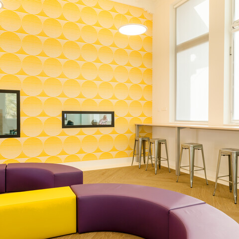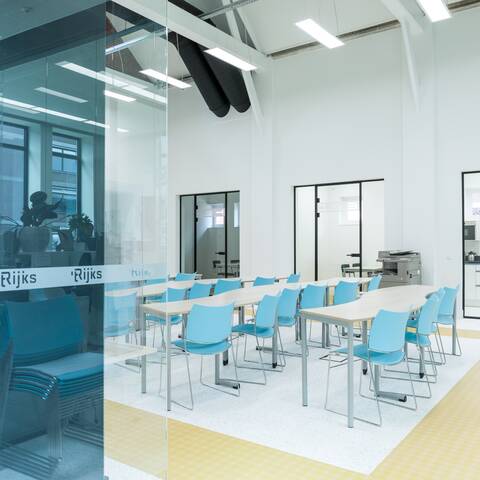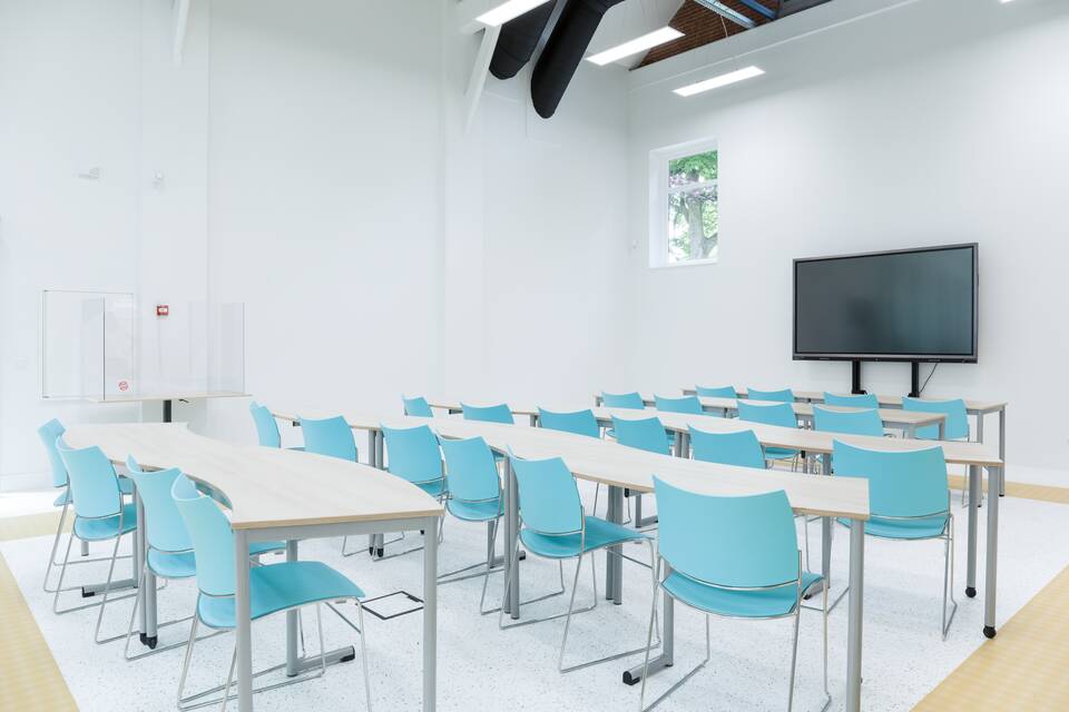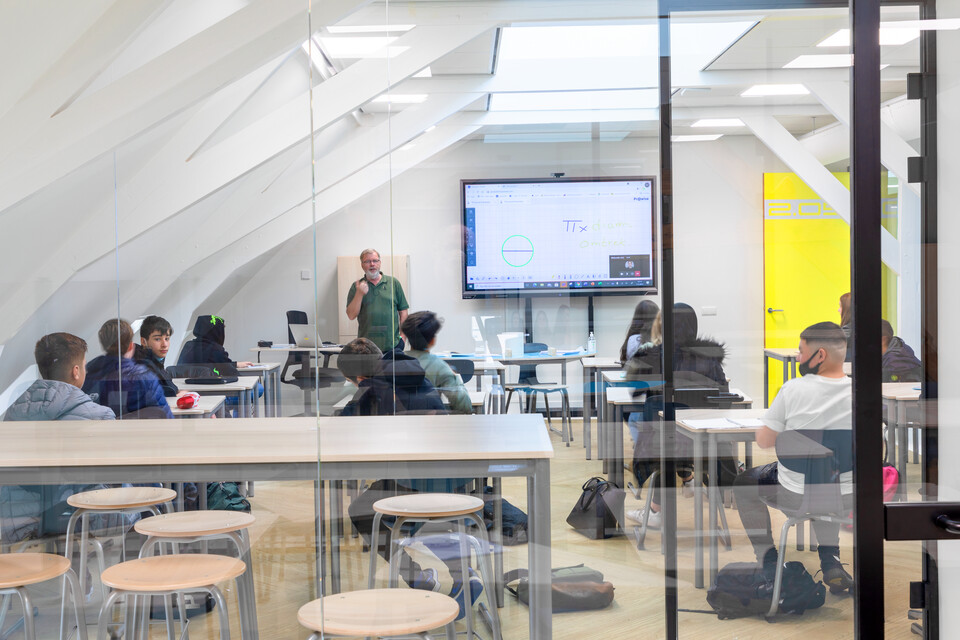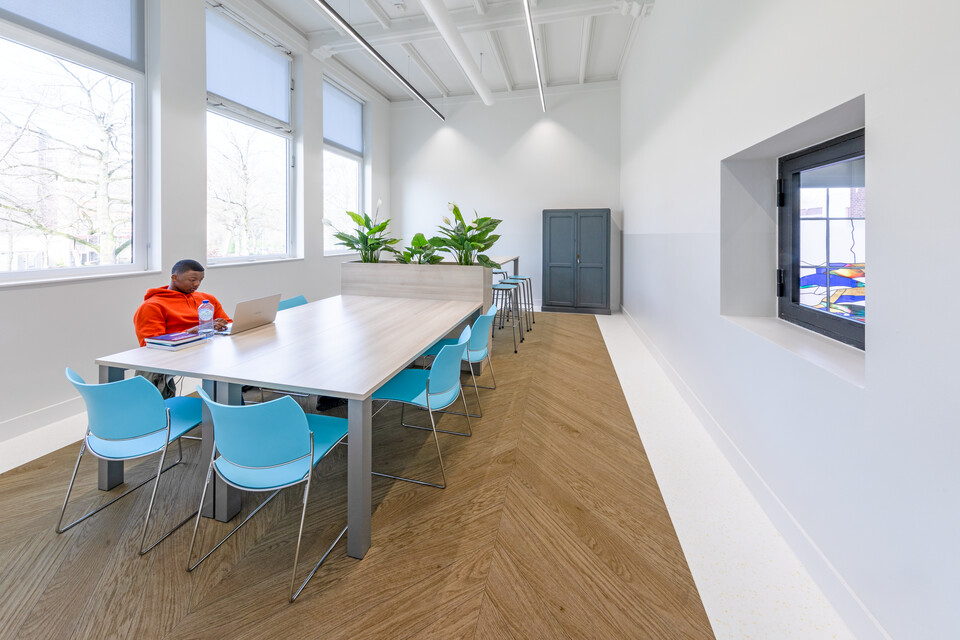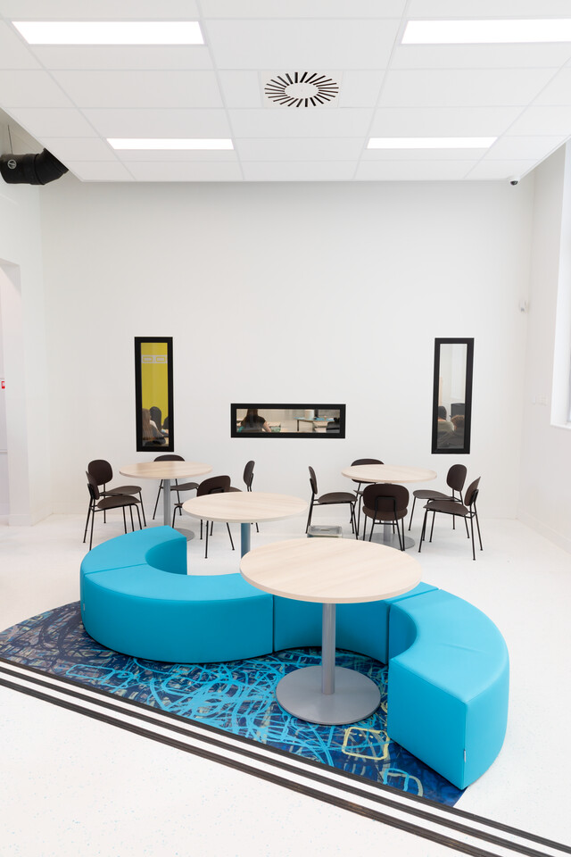 Interieurarchitect Annemieke Tijsseling van Presikhaaf Schoolmeubelen vertaalde het ontwerp inclusief hoofdkleuren van de architect naar inrichtingstekeningen. Zo laten de vloeren van de lokalen en grote leerpleinen een mooie afwisseling zien van marmoleum en een warme parketprint. Karpetten in aansluitende kleuren zijn slim toegepast om in het grote geheel losse plekken aan te duiden. Deze hebben meteen een akoestische werking. Robert Aret, onderwijsinrichtingsspecialist bij Presikhaaf Schoolmeubelen: ‘In de zolderruimte hebben we bewust gekozen voor verschillende soorten hoge en lage meubels, statafels of juist lekkere banken en zelfs stoelfietsen. Door flexibel in te richten hebben we een dynamische leer- en werkomgeving gecreëerd die leerlingen uitdaagt om actief aan de slag te gaan. Het achterliggende idee is dat de verschillende elementen stimuleren om te bewegen; wanneer je met z’n allen iets met plezier doet leidt dat tot een veel beter resultaat.’ In de verschillende lokalen die grenzen aan de open werkruimte staan telkens andere opstellingen van driehoekstafels met centraal een tafel voor instructie aan enkele leerlingen en apart een kleine werkplek voor de docent.