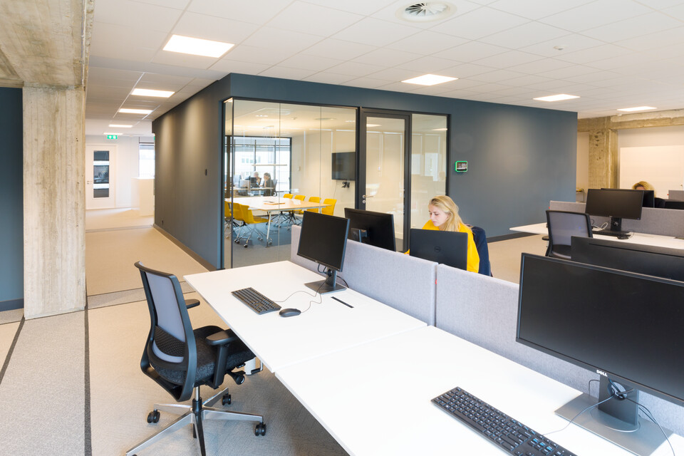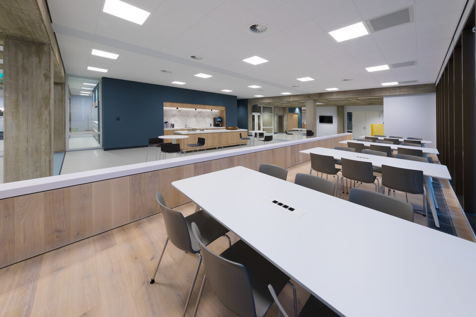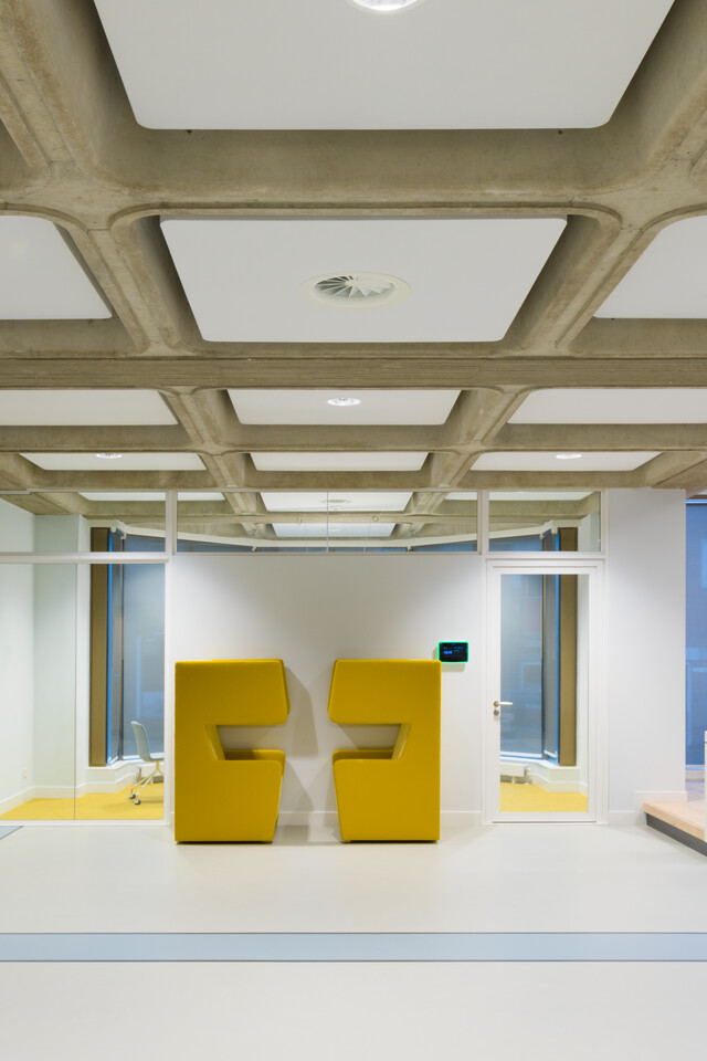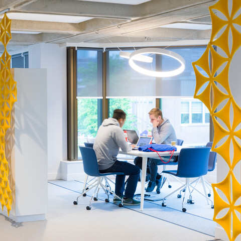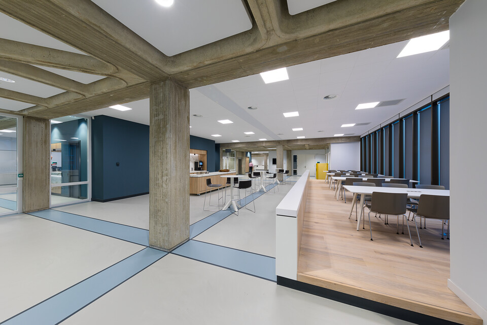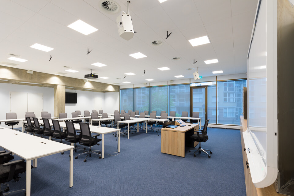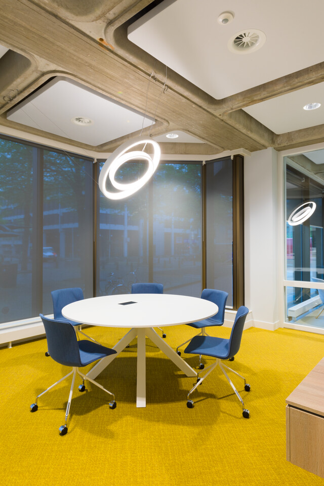 Op basis van dit concept tekende Claartje ten Have van Gispen het interieur verder uit in producten en materialisatie. Een zakelijke, luxe uitstraling en producten met voldoende comfort waren daarbij belangrijke uitgangspunten. Jeroen Verweij, als Business Manager Onderwijs bij Gispen nauw bij dit project betrokken: ‘Het is primair een onderwijsgebouw. Maar we hebben het aangevlogen als een mix tussen een school en een professionele kantooromgeving. Dat is bijvoorbeeld te zien aan de stoelen in de collegezalen: stuk voor stuk comfortabele ZINN bureaustoelen. En de break out rooms, die projectmatig werken ondersteunen, kunnen de vergelijking met een een mooie vergaderruimte goed doorstaan.’
