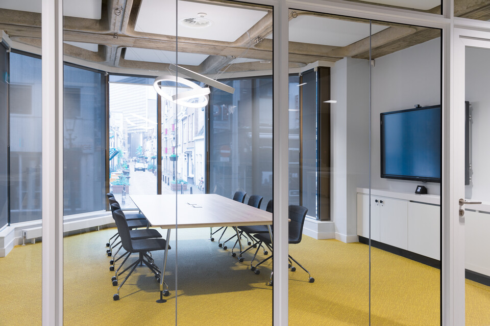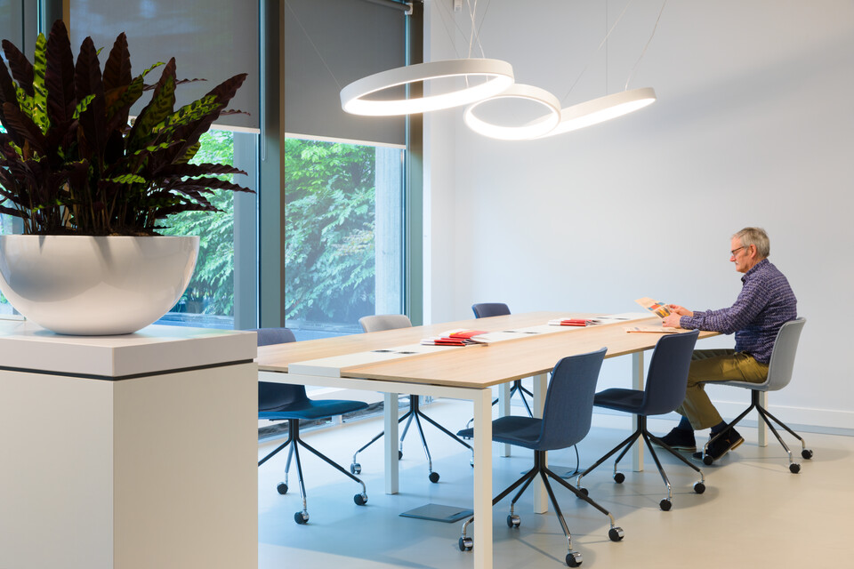 Jeroen Verweij van Gispen: ‘Het mooie aan dit project is dat we hebben kunnen ontwerpen mét de ervaring van een leverancier. Dat leverde een prachtig en realistisch eindresultaat op.’ Gispen leverde onder meer 300 ZINN bureaustoelen, diverse tafels uit het UT-, TM (de voorganger van TMNL)- en Dukdalf-programma en bijna 150 NOMI-stoelen. Verweij: ‘Binnen dit project hebben we het veelzijdige NOMI-programma precies zo kunnen toepassen als het bedoeld is. Vanuit de basis, één kunststof kuip, is het mogelijk om via meerdere typen onderstellen, wel of geen armleggers en afneembare hoezen precies de uitstraling te creëren die je wenst. Van lunch- tot vergaderruimte, van wat soberder tot zeer luxe.’